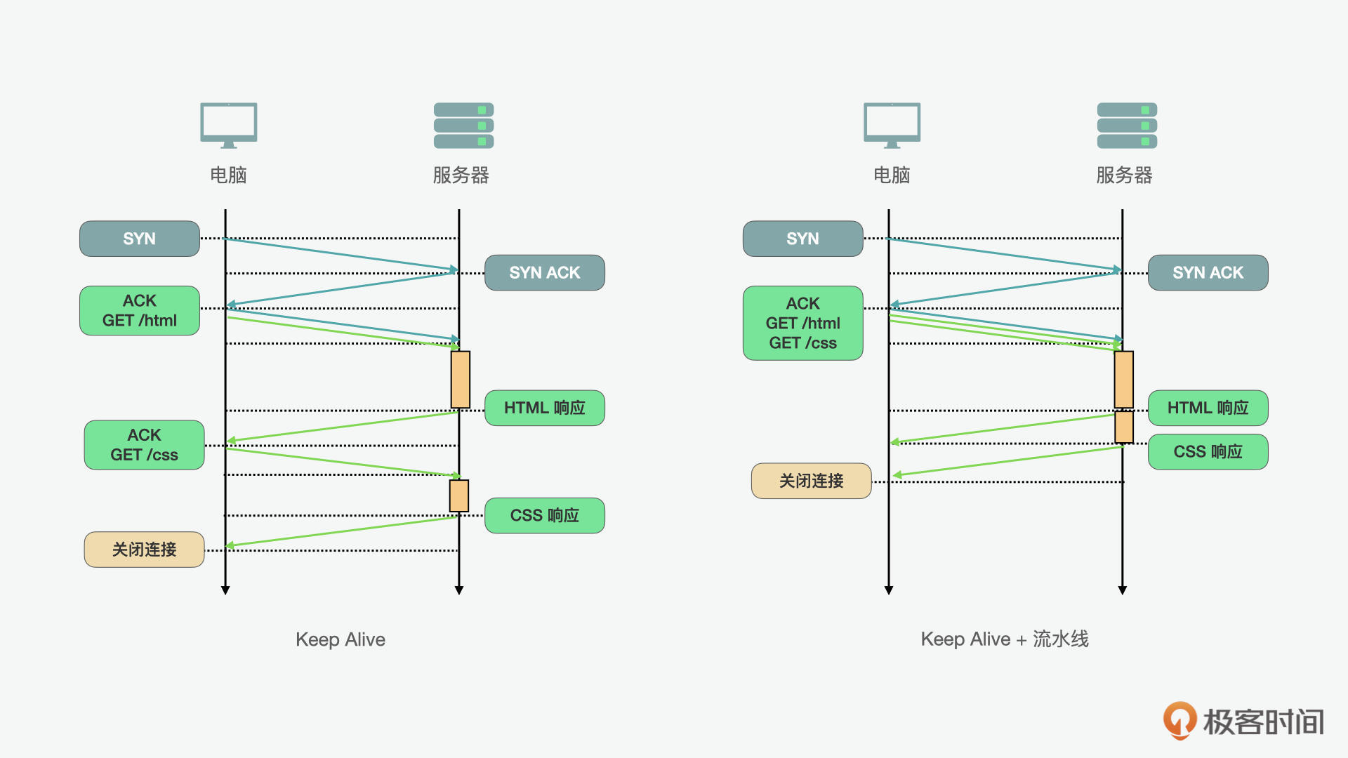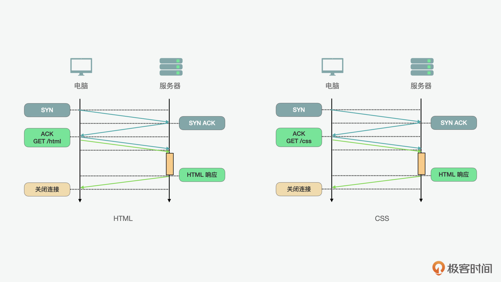 首先我们来看看持久HTTP加流水线的方案。在下面的例子里我们看到,如果前端想要请求HTML和CSS这两个资源,在先后请求的情况下,我们要建立两次连接。每次3次握手的话,两次请求就是一共6次握手。显然这么操作是很费时的。