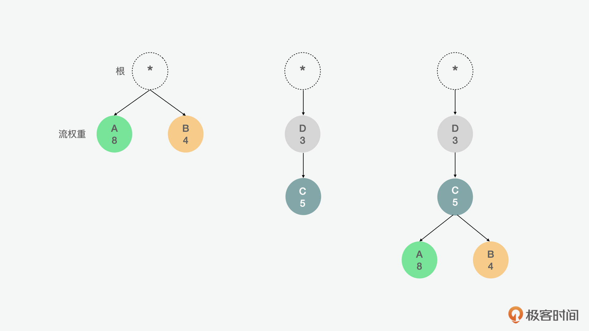 比如在上面的例1中,流A和流B平级,A的权重为8,B的权重为4,因此,A应分配2/3可用资源,B应获得剩余的1/3。在例2中,C依赖于D,因此,D应该在C之前获得全部资源分配。以此类推,在第3个例子中,D应先于C获得全部资源分配,C应先于A和B获得全部资源分配,A应获得可用资源的2/3,B应获得剩余的1/3。