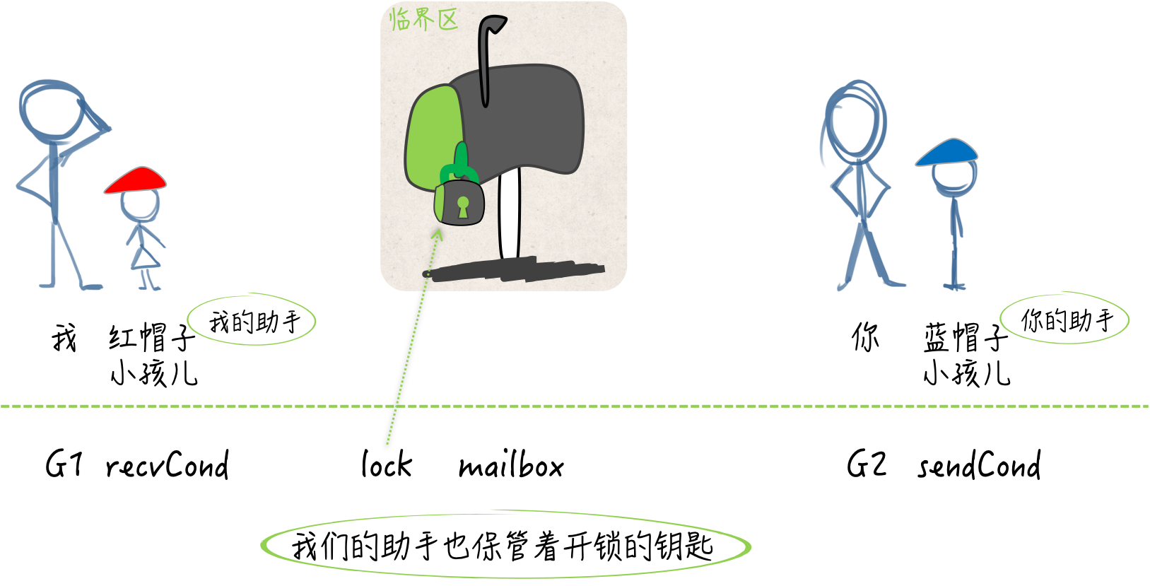 好了,我们现在有四个变量。一个是代表信箱的mailbox,一个是代表信箱上的锁的lock。还有两个是,代表了蓝帽子小孩儿的sendCond,以及代表了红帽子小孩儿的recvCond。