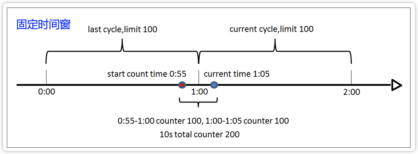 为了解决临界点问题,滑动时间窗算法应运而生,它的实现原理是,两个统计周期部分重叠,从而避免短时间内的两个统计点分属不同的时间窗的情况,如下图所示: