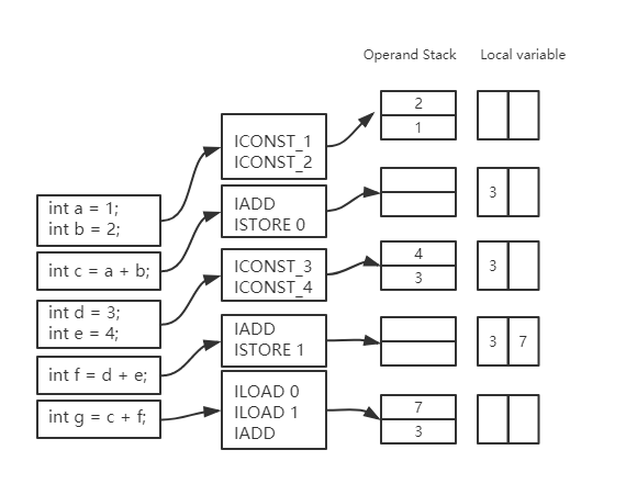 - 数据交换。如下图所示,在经过IADD指令操作后,又通过ISTORE 0指令将栈顶int值存入第1个本地变量中,用于临时保存,在最后的加法过程中,将0和1位置的本地变量取出压入操作数栈中供IADD指令使用。关于本地变量和操作数栈数据交互的指令,你可以参考虚拟机规范,里面提供了一系列根据不同数据类型的指令。