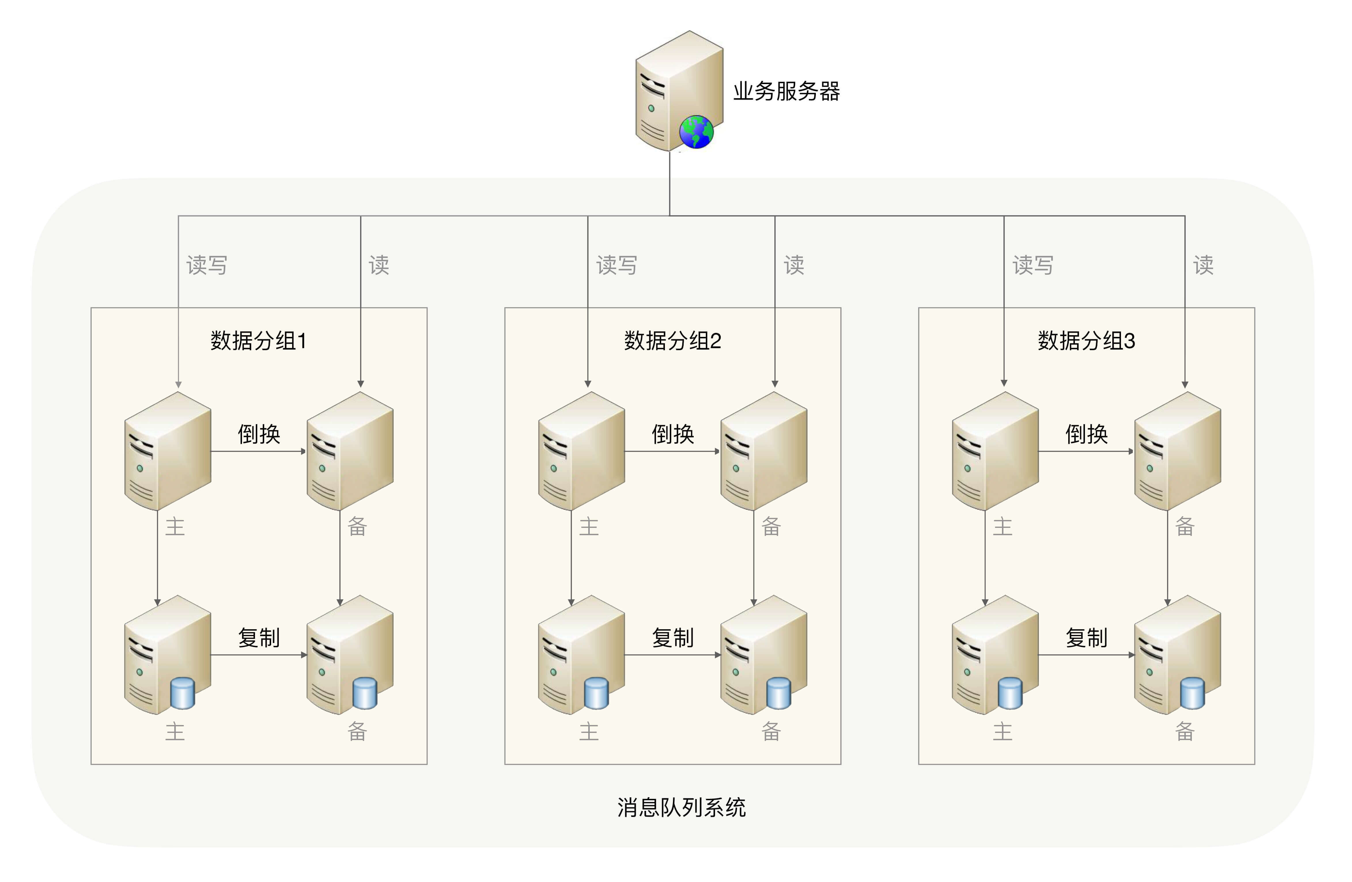 每个分组有一主一备两台服务器,主服务器支持发送和读取消息,备服务器只支持读取消息,当主服务器正常的时候备服务器不对外提供服务,只有备服务器判断主服务器故障的时候才对外提供消息读取服务。