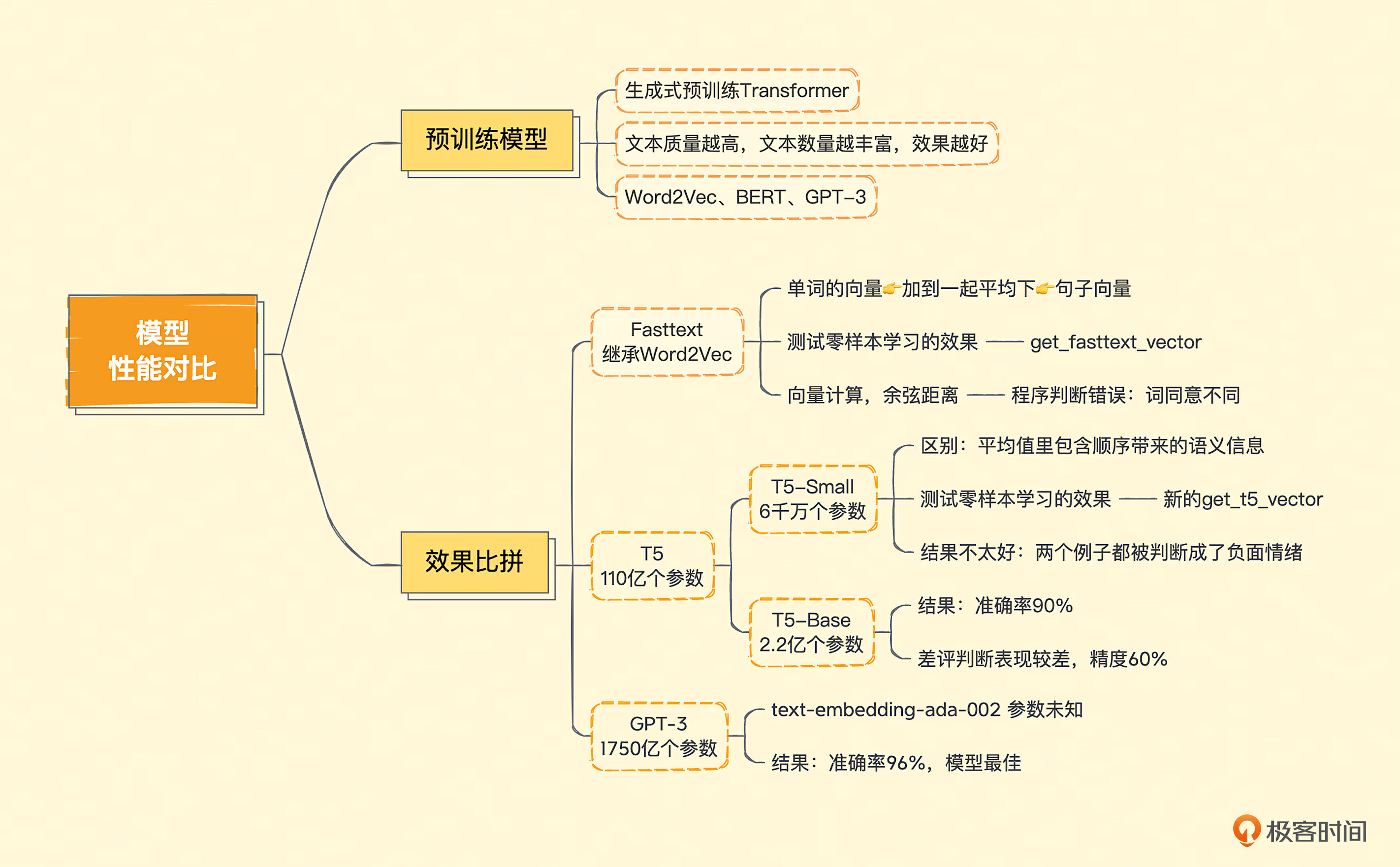 这一讲我们一起使用 Fasttext、T5-small 和 T5-base 这三个预训练模型,做了零样本分类测试。在和之前相同的食物评论的数据集上,使用只学习了单词向量表示的Fasttext,效果很糟糕。当我们换用同样基于Transformer的T5模型的时候,T5-small这个6000万参数的小模型其实效果也不好。但是当我们用上2.2亿参数的T5-base模型的时候,结果还可以。不过,还是远远比不上直接使用OpenAI的API的效果。可见,模型的大小,即使是对情感分析这样简单的问题,也能产生明显的差距。