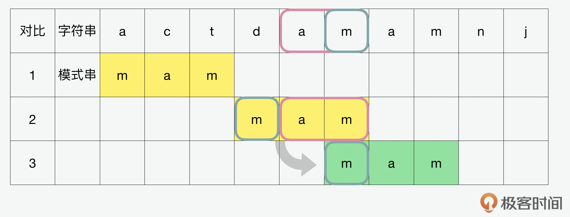 从上图中,我们可以看到如果使用暴力,也叫朴素(naive) 算法的话,在每一轮的迭代中,字母是一个一个移动的,直到匹配到为止,这种滚动匹配的方式一共要经历6个迭代。所以暴力算法虽然简单粗暴,但是效率却不高。而BM算法的话,可以用到图中坏字符(bad character) 这种方式,在字符串中看到和模版不匹配的坏字符就滑动跳过。除了坏字符,还有好后缀(good suffix) 的方式也可以达到类似的效果,它的原理就是在字符串中看到和模版匹配的好后缀就滑动对齐。这样通过跳过或对齐的滑动匹配的方式就能减少迭代的步骤。