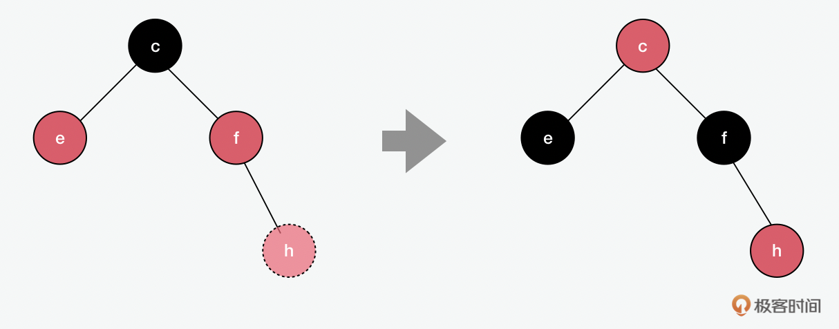 基于上面的原则,我们可以在上图看到,当我们想要加入h的时候,如果它是根节点,就直接用黑色即可;但它是叶子节点,所以是红色。插入后,如果父节点f是黑色,那就什么都不用做;但f是红色,所以就要把f改成黑色,除了父亲,往上的祖父节点也要跟着调整。从c出发的节点要包含相同数量的黑色节点,所以e的颜色也会相应调整为黑色。在下面例子中,我们看到除了换色,红黑树和AVL一样,有时也需要用到旋转。