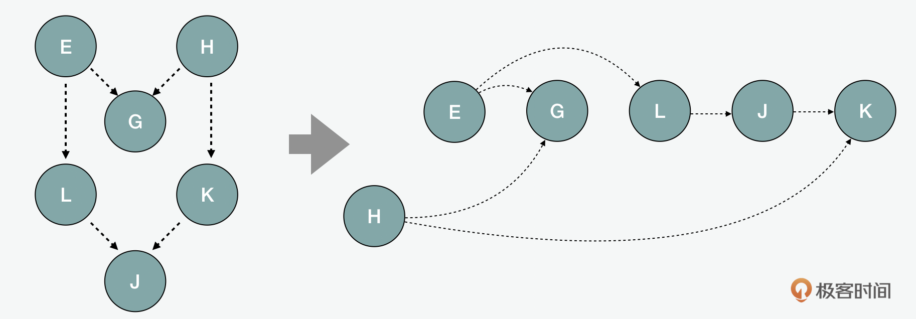 其实简单地来说,拓扑排序用的就是从一个节点开始,进行深度优先的遍历,直到和它相连的每个顶点都用递归方式穷尽为止。每一次递归中的节点被加到一个访问过的visited集合中,以此类推,最后,在递归结尾,把节点用unshift以相反的顺序插到数组头部。