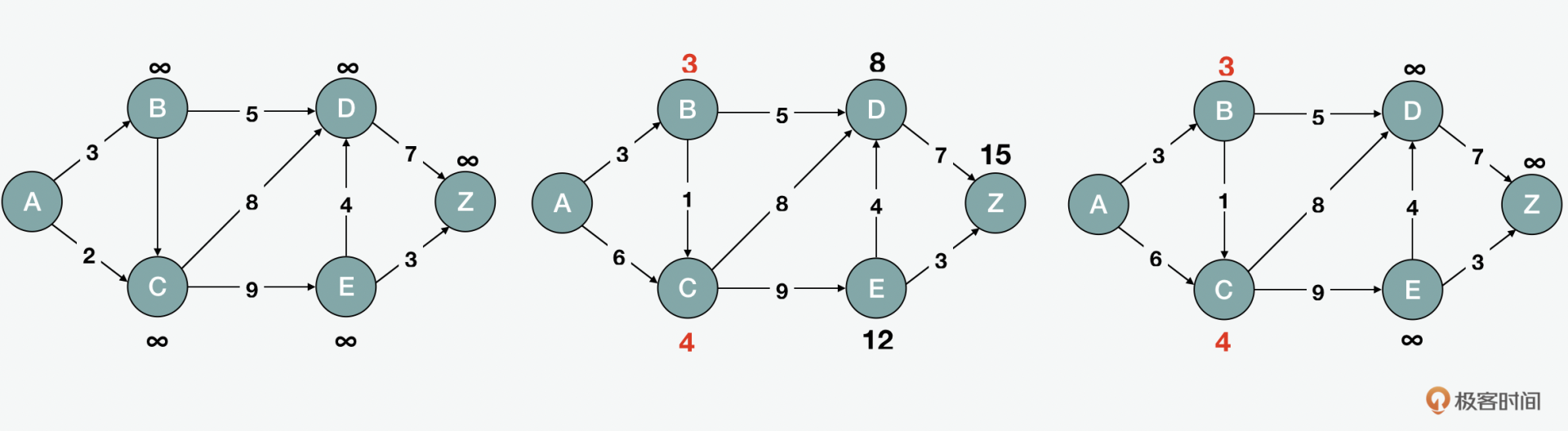 最短路径在生活中非常常见,比如我们常用的地图。常见的最短路径的算法有迪杰斯特拉Dijkstra和弗洛伊德-沃舍尔Floyd-Warshall。下面我们可以选Dijkstra(迪杰斯特拉)算法来看看。如图所示,假设我们要计算从A到B、C、D、E和Z的最短距离。