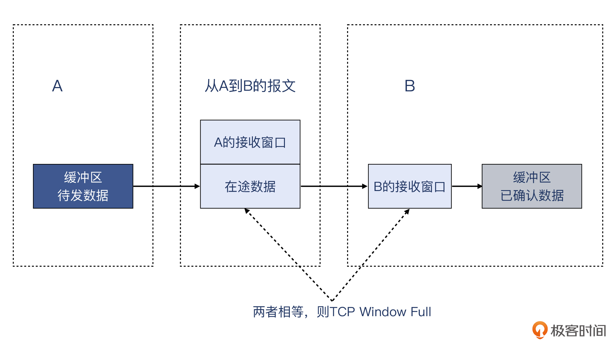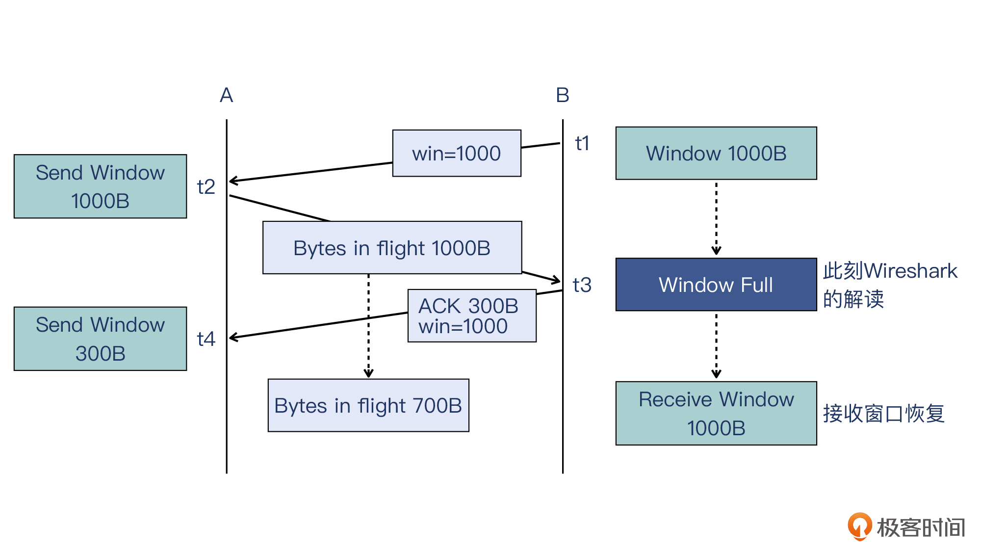 - is now completely Full:窗口满了,这又怎么理解呢?你还记得在上节课里学过的在途数据,也就是Bytes in flight吗?当在途数据的大小等于接收窗口的大小时,这个窗口就是“满了”。