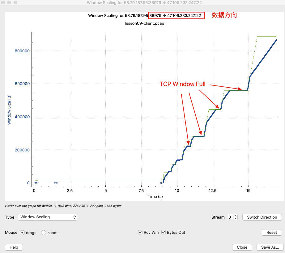 当接收窗口成为瓶颈的时候,很容易就出现这里的TCP Window Full的现象。不过,我们这么多讨论都是基于文字,如果有更加直观的方式,让我们理解这个现象就更好了。这里,我们就可以再学一个Wireshark的小工具:TCP Stream Graphs里面的 Window Scaling。