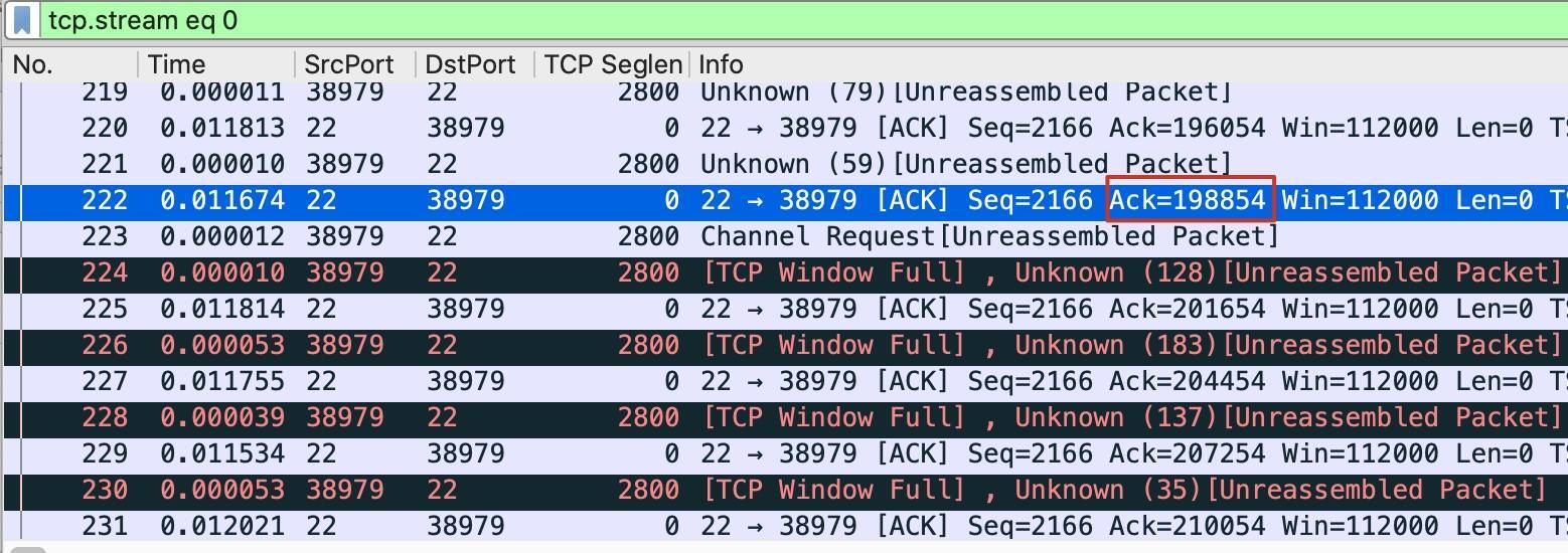 让我们回到Wireshark窗口,找到离这个TCP Window Full最近的,从源端口22发送来的报文。我们发现,它就是下图这个222号报文: