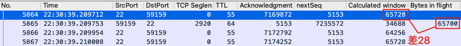 接收端(源端口为22)的接收窗口为65728,发送端(源端口为59159)的在途数据为65700,两者相差只有28字节。对于发送端来说,没有必要为了这区区28字节再发送一个小报文了,等接收窗口空余出多一点的空间后再动身不迟。
