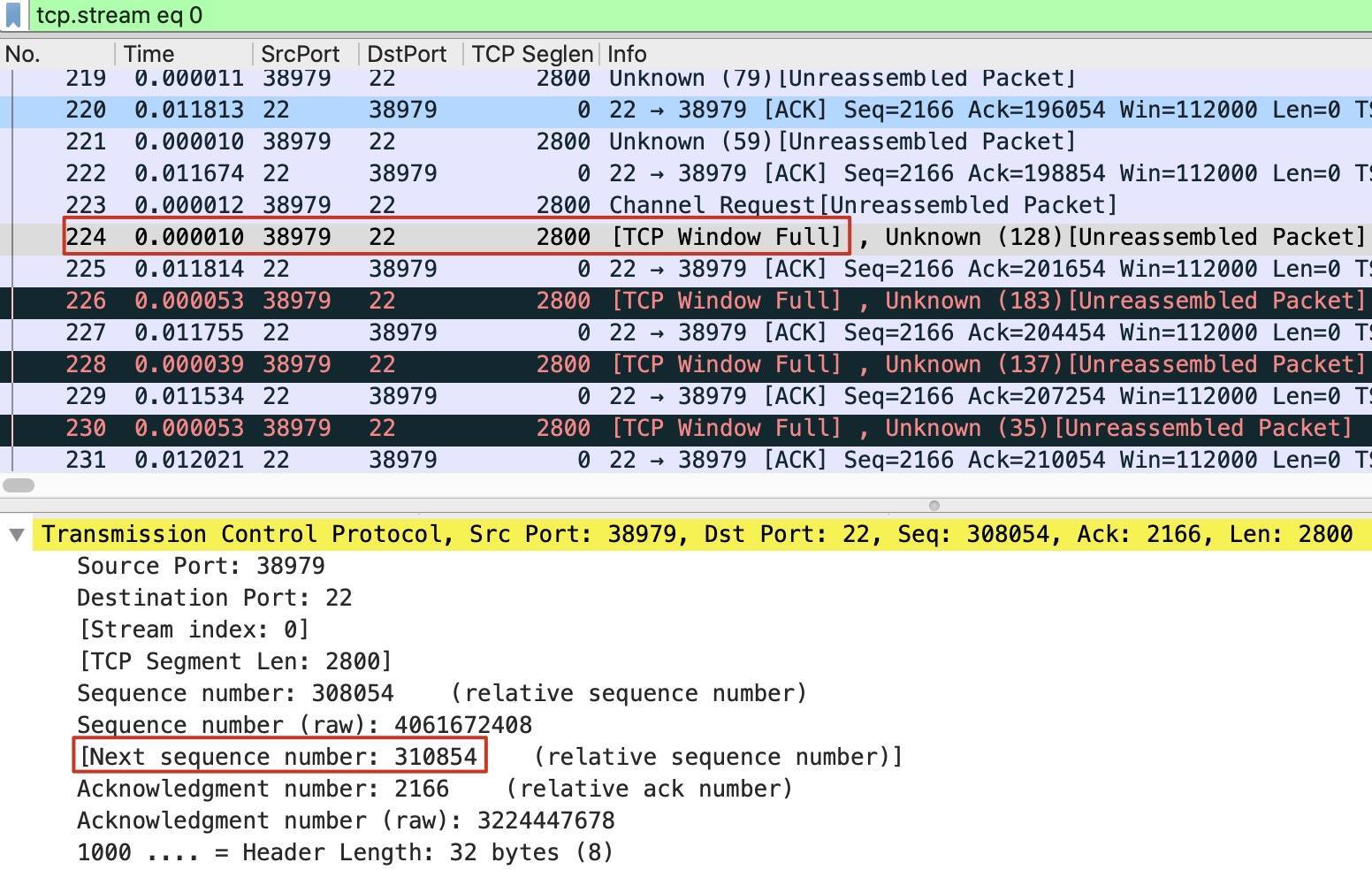 因为这次通信是SCP文件传输,那么A就是客户端,它的端口是38979;B就是服务端,它的端口是22。我们的具体做法是:在抓包文件里,找到B(也就是源端口为22)的报文,而且应该是这个TCP Window Full报文之前的最近的一个,在这个报文里就有B的最近的接收窗口值。