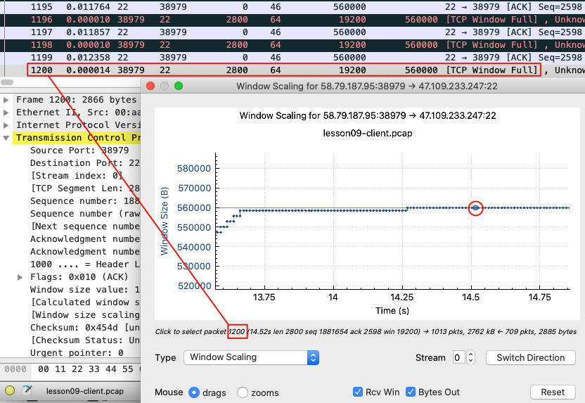 上图中,我用鼠标放大了一个“平台”,然后选中了一个Receive Window和Bytes Out重合的点,它是1200号报文,主窗口也自动定位到了这个报文,果然它也是一次TCP Window Full。