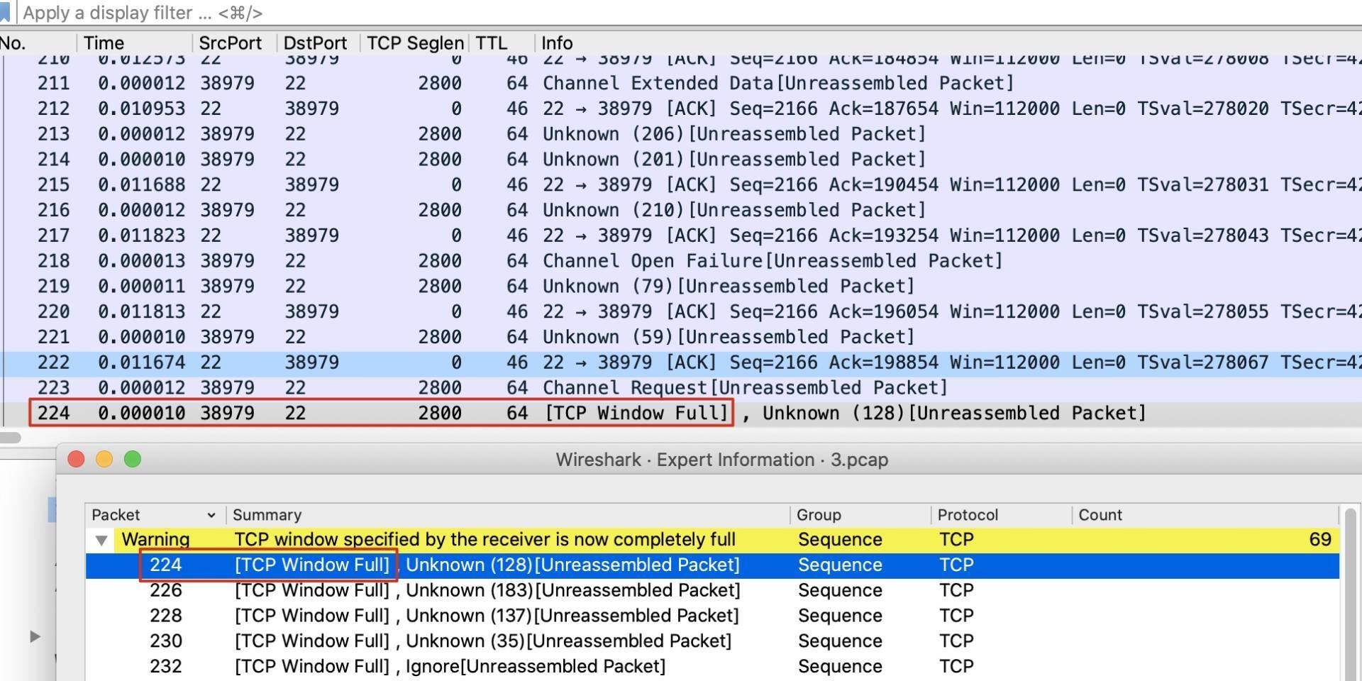 我们可以看到,除了224报文,也确实有很多其他报文也报了TCP Window Full的警告信息。