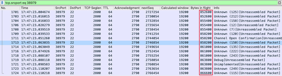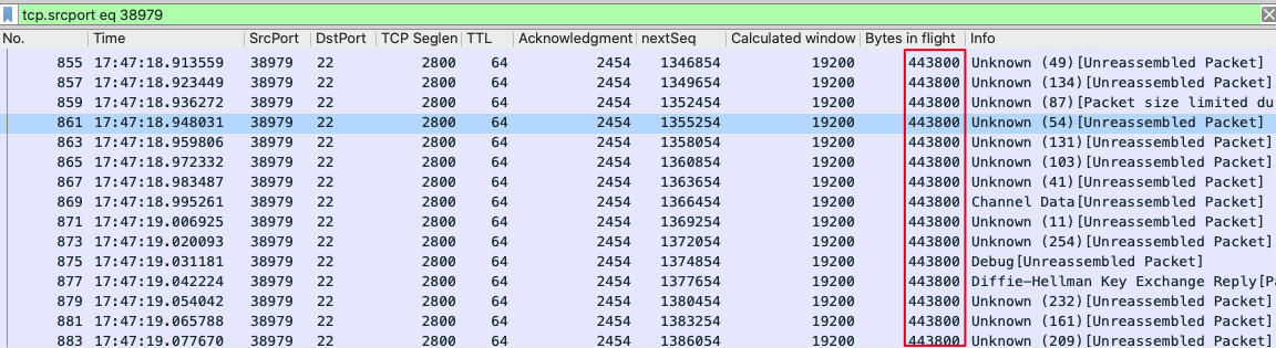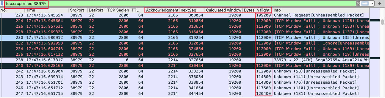 另外,因为我们要集中检查发送端的Bytes in flight,就需要把源端口38979的报文过滤出来,这样就不会被另一个方向的报文给干扰了。