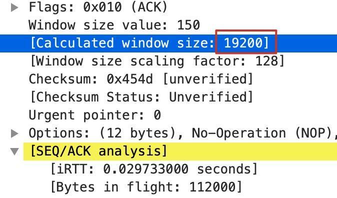 前面提到过,在途数据(或者叫在途字节数,Bytes in flight)等于接收窗口大小的时候,Wireshark就会解读为TCP Window Full了。不过,如果你在上图中找一下Window size,会发现它是19200,而不是Bytes in flight的112000,这又是为什么呢?