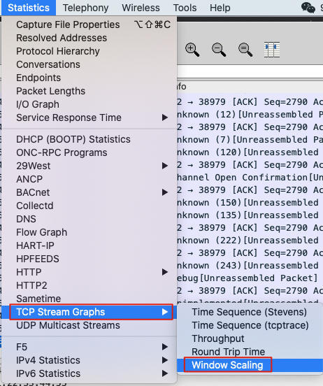 我们还是打开Wireshark的Statistics下拉菜单,找到TCP Stream Graphs,在二级菜单中,选择Window Scaling:
