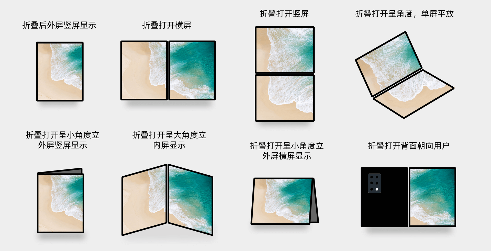 从屏幕完全合并、完全打开再到部分打开的中间态,折叠屏有非常多的可能使用场景。所以当你需要考虑折叠屏场景运用的时候,请注意这些变化。以下我以内折带外屏的情况,给你做一个示例。