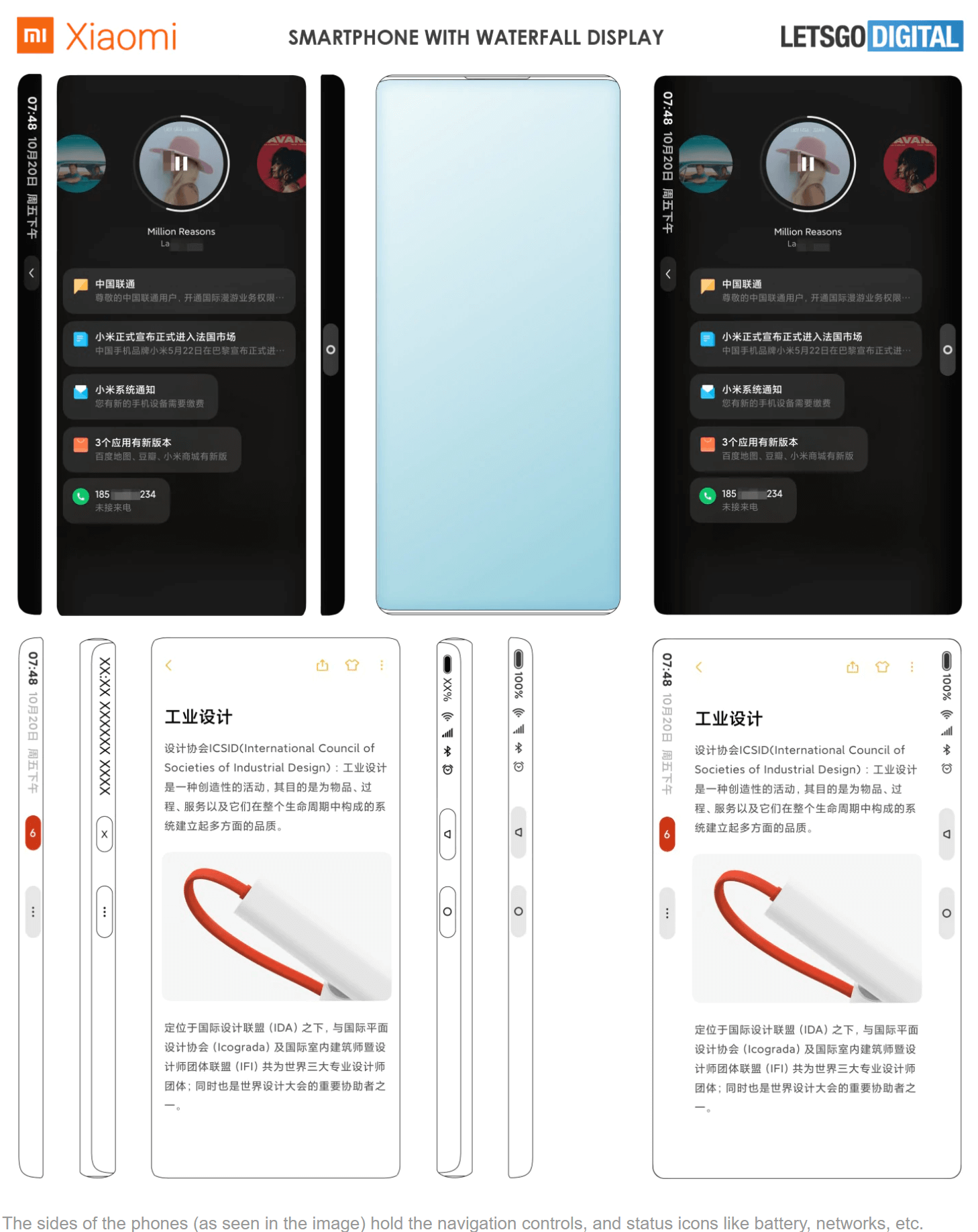 侧边屏显示哪些信息会好一些呢?小米的概念设计里针对侧边的显示做了一些视觉上的尝试,比如把信号栏直接移到侧边,让正面屏幕更为沉浸在某一个应用中。但尴尬的情况在于,以前手机一亮屏用户就知道还有多少电量或者时间,现在恐怕要把手机侧过来才能看到了。