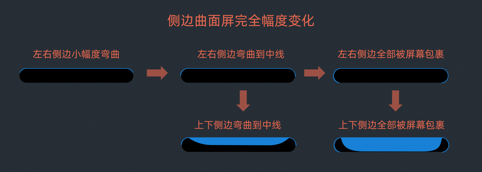 智能手机演进从一开始的仅减少物理按键、屏幕越来越大直到变成全面屏后,在二维演进方向上已经没有了太多的发挥空间。在柔性屏技术的加持下,开始从立体屏幕和多块屏幕的维度演进变化。下面我分别给出了这两波变化演进的示意图,其中第二波演变还在进行当中。