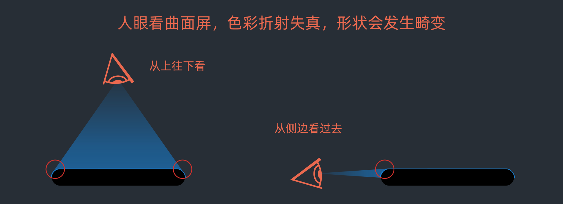 从显示维度来看,瀑布屏从正上方看过去,侧边玻璃会因为光线折射的原因出现色彩失真以及图像畸变,或者干脆看不清楚。即便视线真正从侧边看过去,如果有弧度,依然存在类似问题。