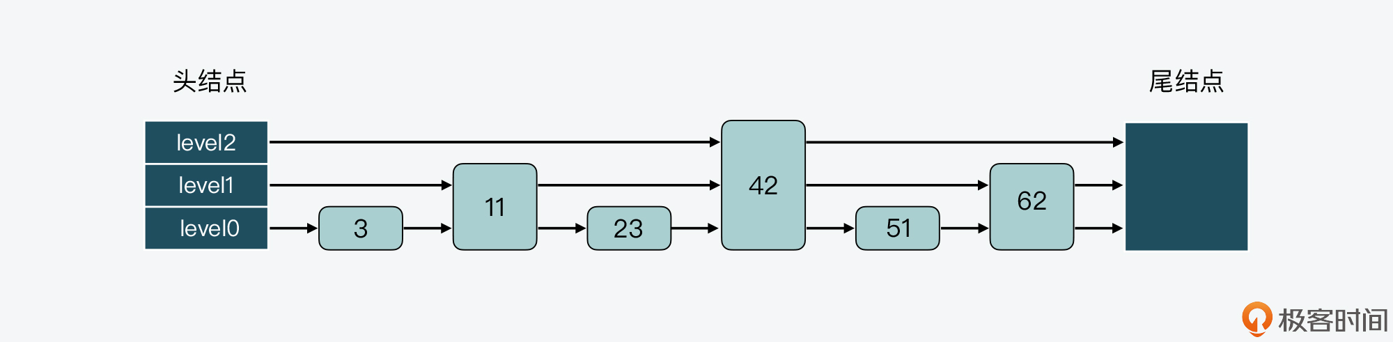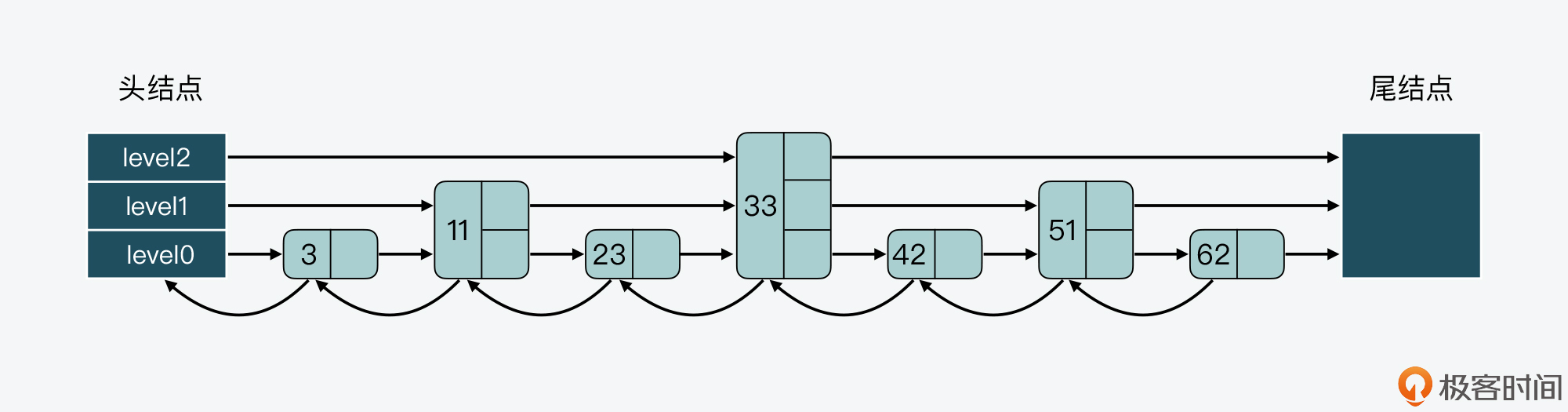 可以看到,在level 0上一共有7个结点,分别是3、11、23、33、42、51、62,这些结点会通过指针连接起来,同时头结点中的level0指针会指向结点3。然后,在这7个结点中,结点11、33和51又都包含了一个指针,同样也依次连接起来,且头结点的level 1指针会指向结点11。这样一来,这3个结点就组成了level 1上的所有结点。