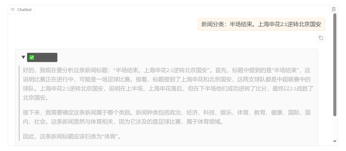之后就是常规的向大模型提问,以及反馈答案的代码了。我们就以“新闻分类:《美国队长4》被调侃为《关云长4:周仓传》”为例,进行测试。
