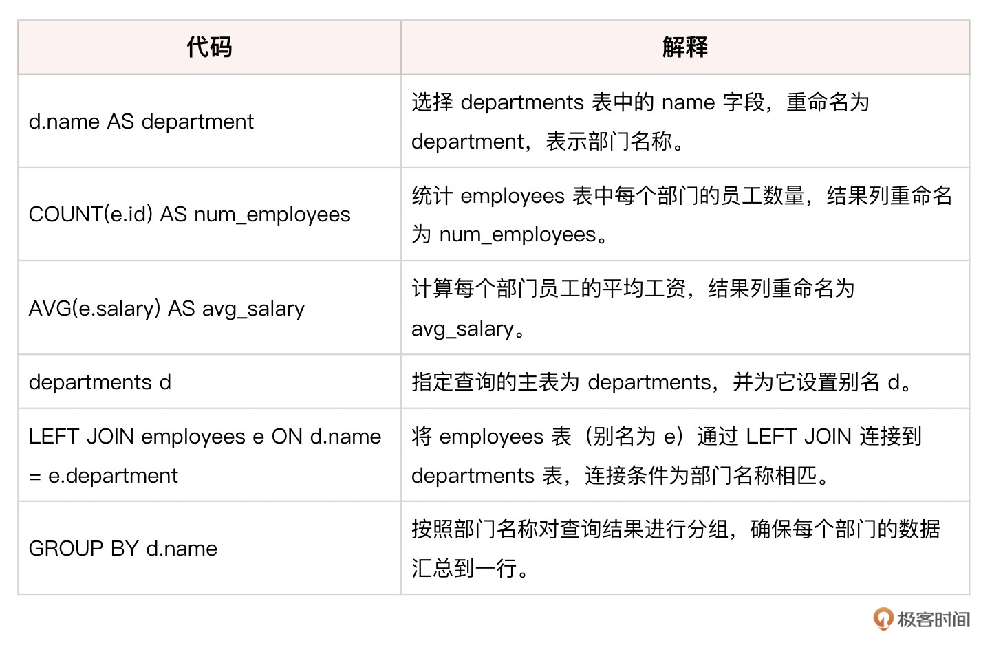 这个查询通过结合 departments 和 employees 两个表,为每个部门提供了员工数量和平均工资的数据。