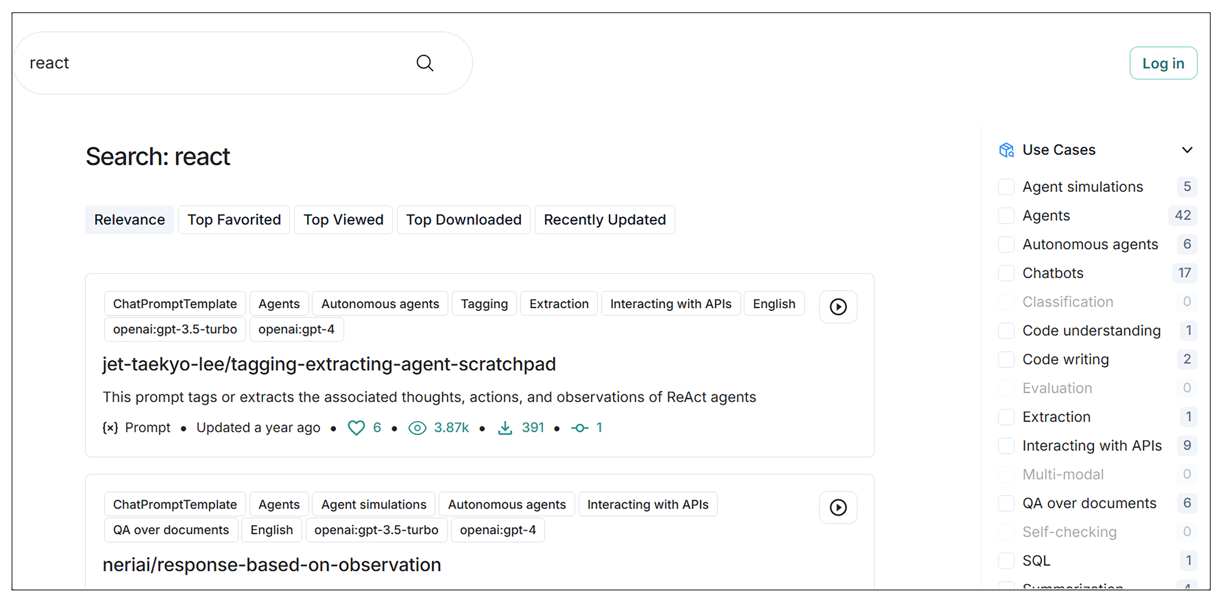 例如,我们在搜索框输入 react,可以看到有多条 ReAct Prompt。也可以在右侧点击分类进行过滤。