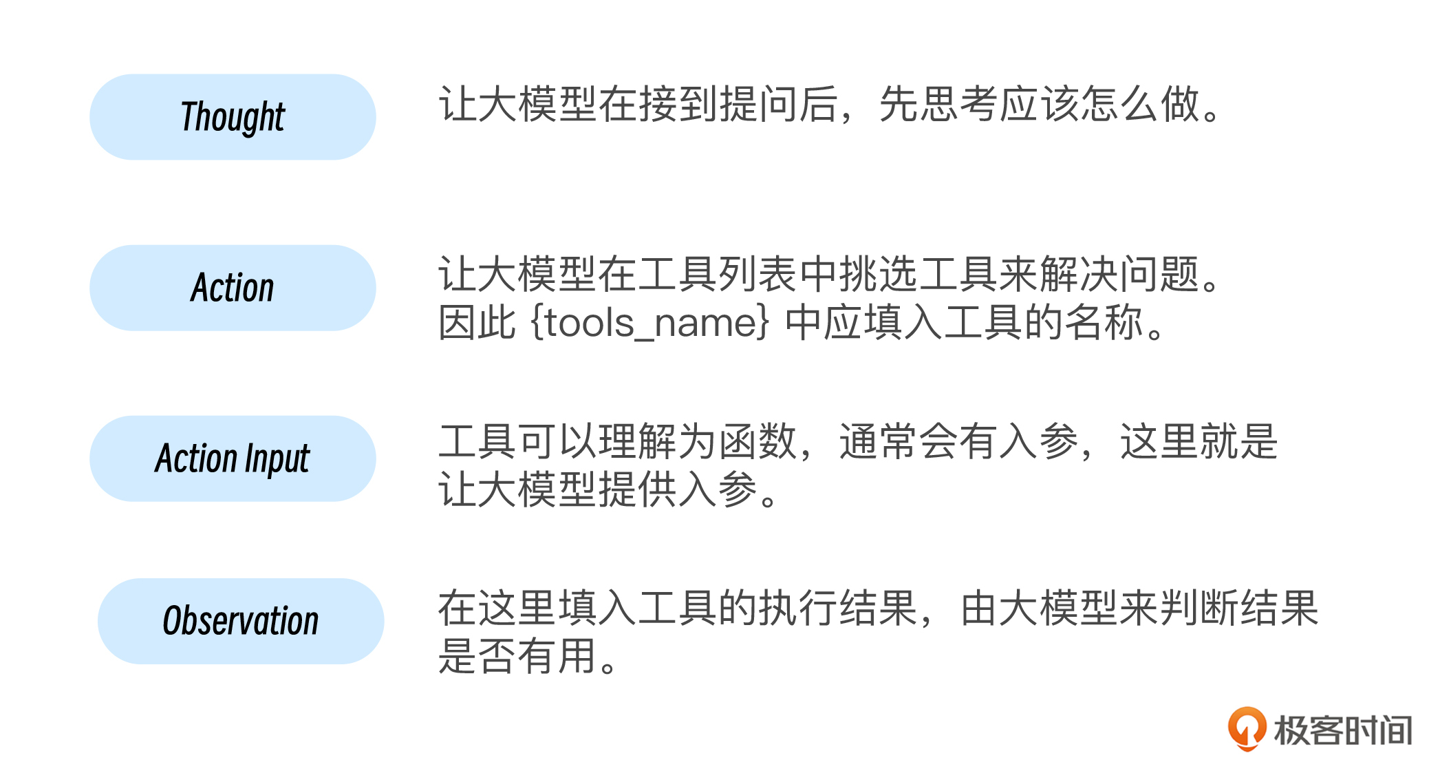 这段 prompt 开头的 {instructions} 其实是为大模型设置人设。之后告诉大模型,使用 {tools} 中定义的工具。因此在 {tools} 里,应该填入工具的描述。工具的描述我们会在下文中,为大家介绍如何编写。