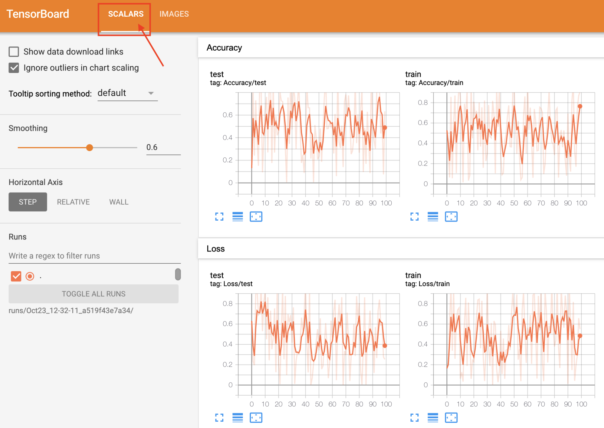 启动后,在浏览器中输入“http://127.0.0.1:6006/”(Tensorboard的默认端口为6006),即可对刚才我们记录的数据进行可视化。