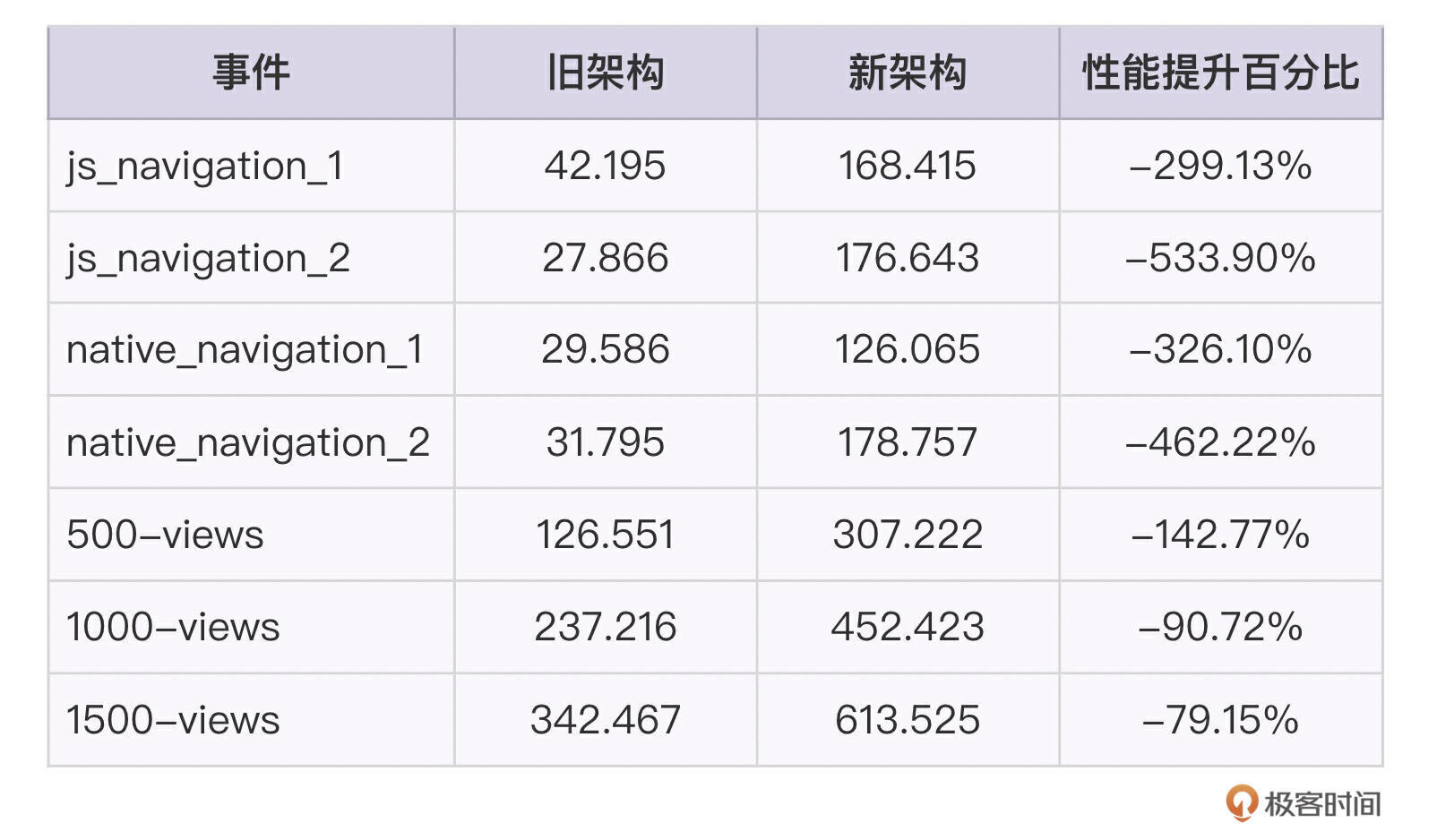 优化后,官方通过在ScrollView组件中大量渲染View、Text或Image组件(1500或5000个),以测试新架构的性能。根据官方给出的性能测试报告,Android的渲染性能提升了0%~8%,而iOS的提升更为明显,达到了13%~39%。