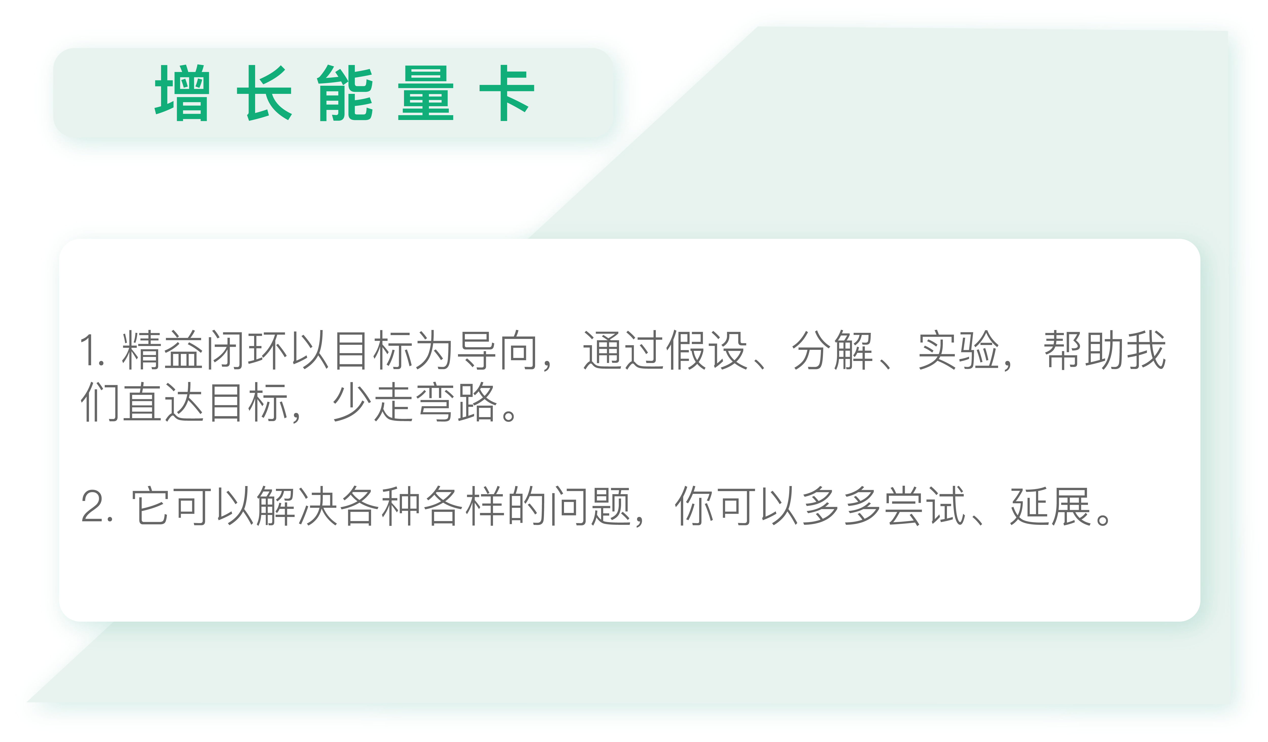 到这里,精益闭环的部分就完全讲完了。在下一讲我们会进入一个新的模块。希望你可以活学活用,尝试在生活中用精益闭环的思路解决问题,产生不一样的结果。