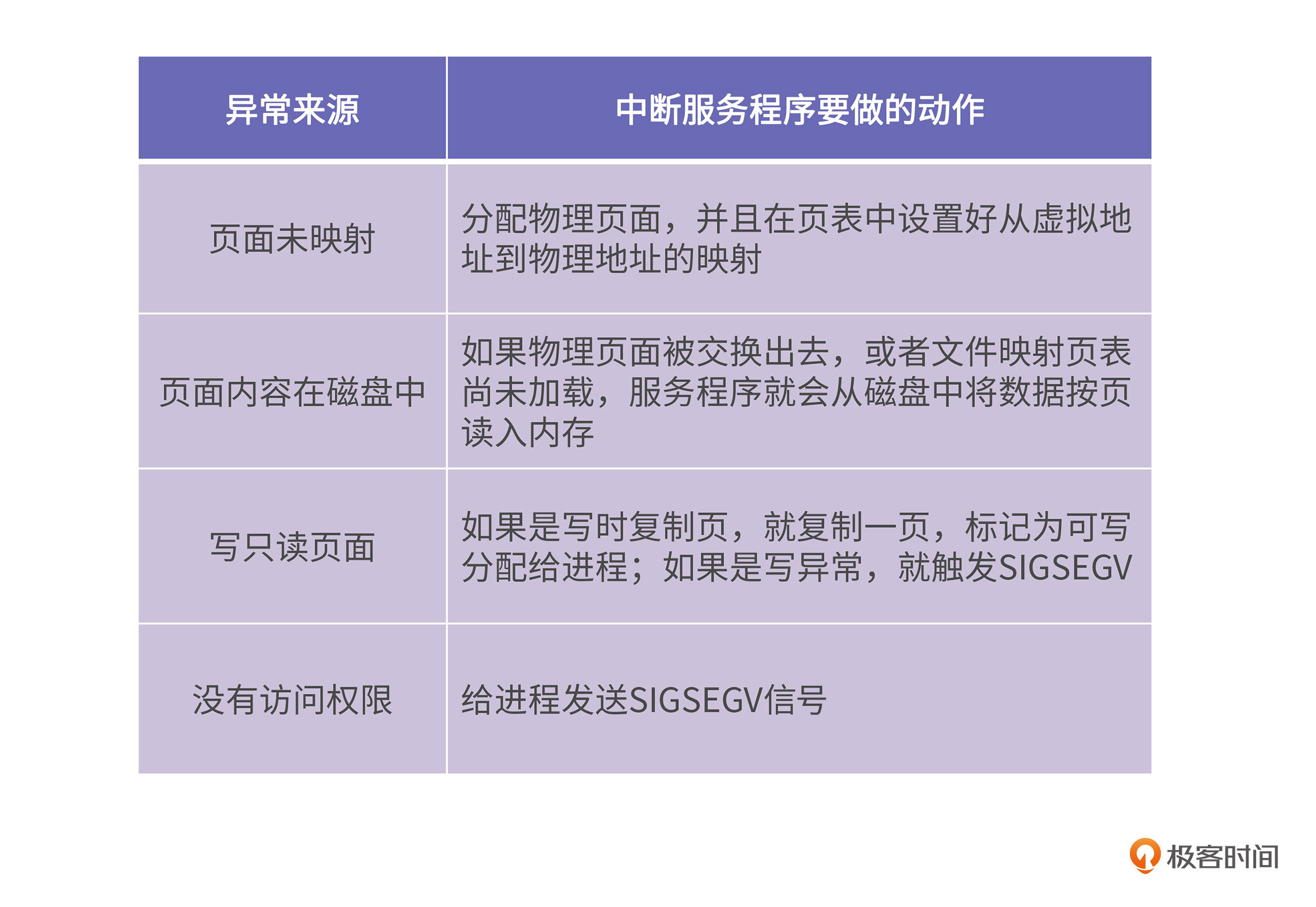 这节课,我们先介绍了页中断产生的原因,大致可以分为缺页中断、写保护中断和非法访问造成的中断等等。