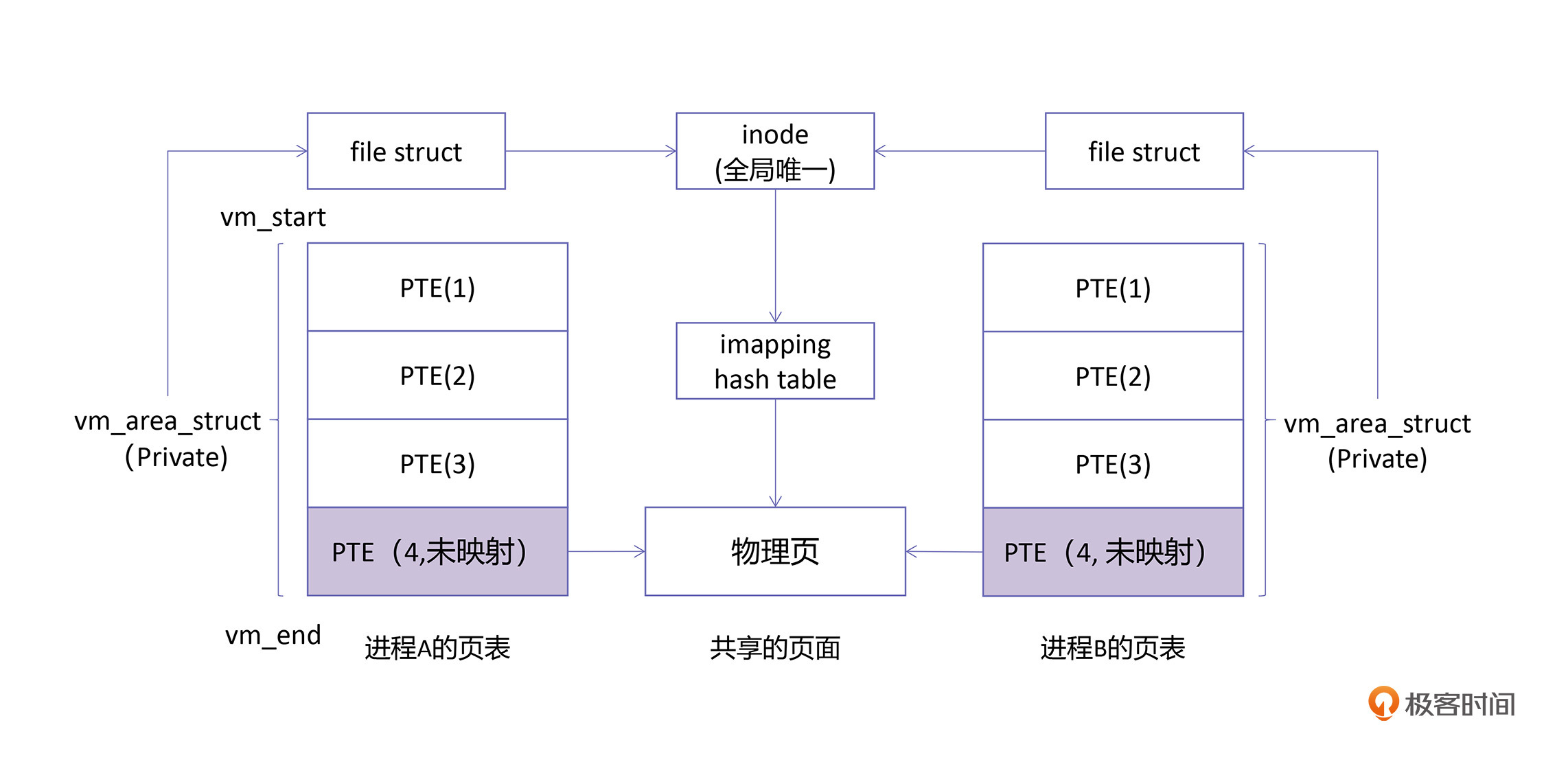 在inode结构中,有一个哈希表,以文件的页号为key,以物理内存页为value。当进程A打开了文件f,然后读取了它的第4页,这时,内核就会把4和这个物理页,放入这个哈希表中。当进程B再打开文件f,要读取它的第4页时,因为f的第4页的内容已经被加载到物理页中了,所以就不用再加载一次了。只需要将B的虚拟地址与这个物理页建立映射就可以了,如下图所示: