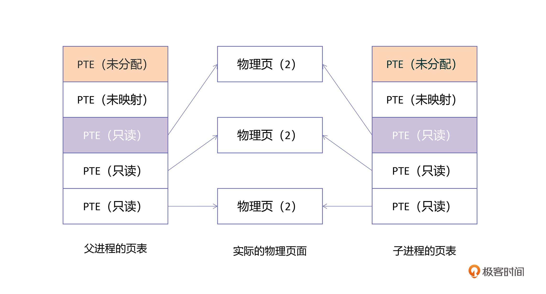 当父进程再访问到这个地址时,也会触发一次写保护中断,这时系统发现物理页的引用计数为1,那就只要把父进程PTE中的权限,简单地从只读变为读写就可以了。这个过程比较简单,我就不画图了,你可以自己思考一下。