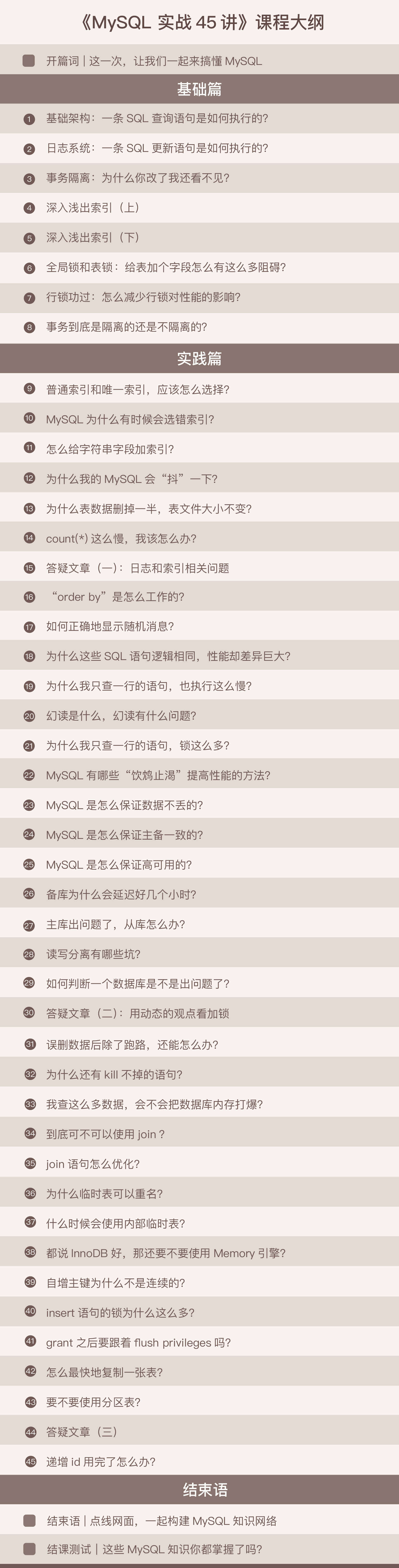 于是,我希望这个专栏能够帮助这样的一些开发者:他们正在使用MySQL,知道如何写出逻辑正确的SQL语句来实现业务目标,却不确定这个语句是不是最优的;他们听说了一些使用数据库的最佳实践,但是更想了解为什么这么做;他们使用的数据库偶尔会出问题,亟需了解如何更快速、更准确地定位问题,甚至自己解决问题……