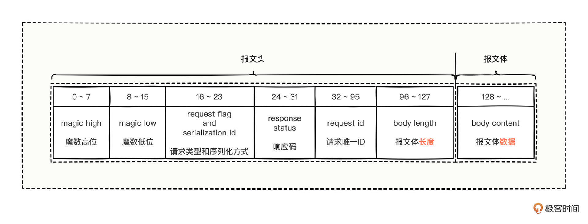 Dubbo 协议的数据帧格式,是一个非常典型的协议格式案例,你以后在实际开发中,如果需要自定义数据传输报文格式,也可以参照 Dubbo 的协议数据格式,稍加改造一番,然后自行通过代码编码和解码就可以了。