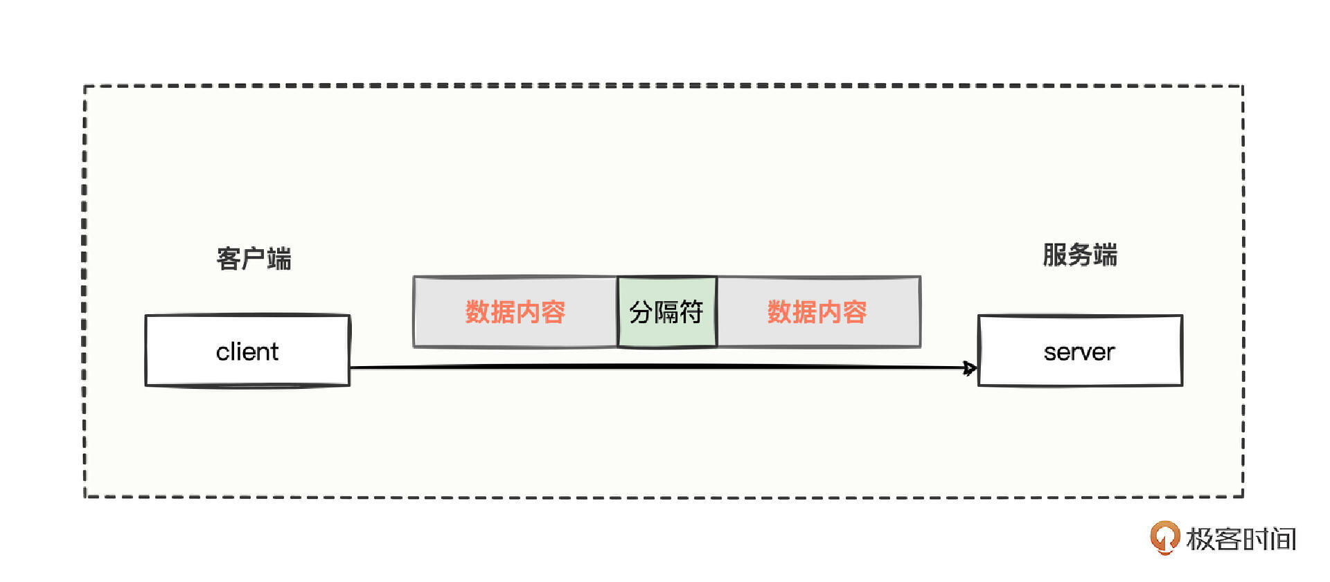 针对这个问题,我们梳理了帧格式的概念,借助 client 向 server 发送数据的简单模型案例,引出了 client 与 server 约定了三种类型的协议格式,分别是固定长度、分隔符、定长+变长。