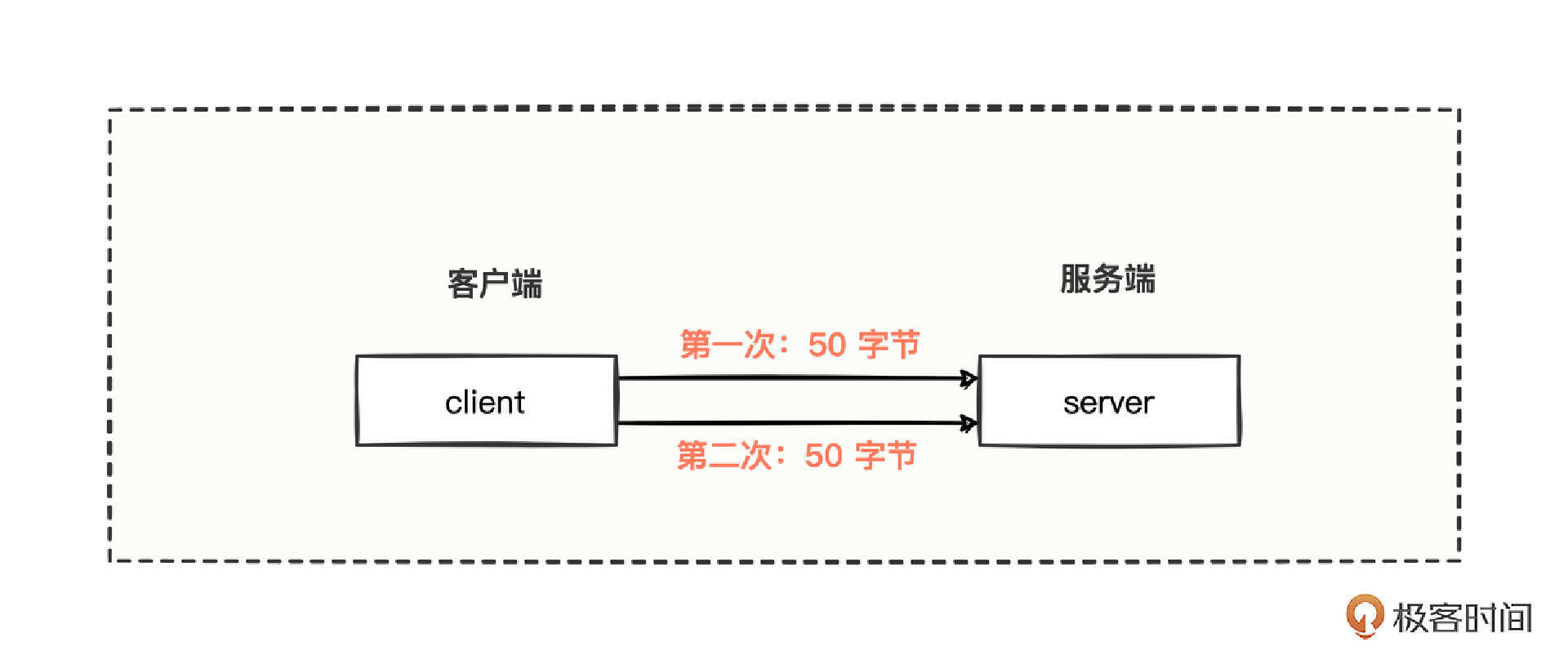 现在我们有 100 字节的数据,需要通过 client 发送出去,可是 client 的发送缓冲区太小了,缓冲区每次只能容纳 50 字节大小。所以,client 利用 socket 进行了 2 次 write 操作,才把 100 字节发送出去。