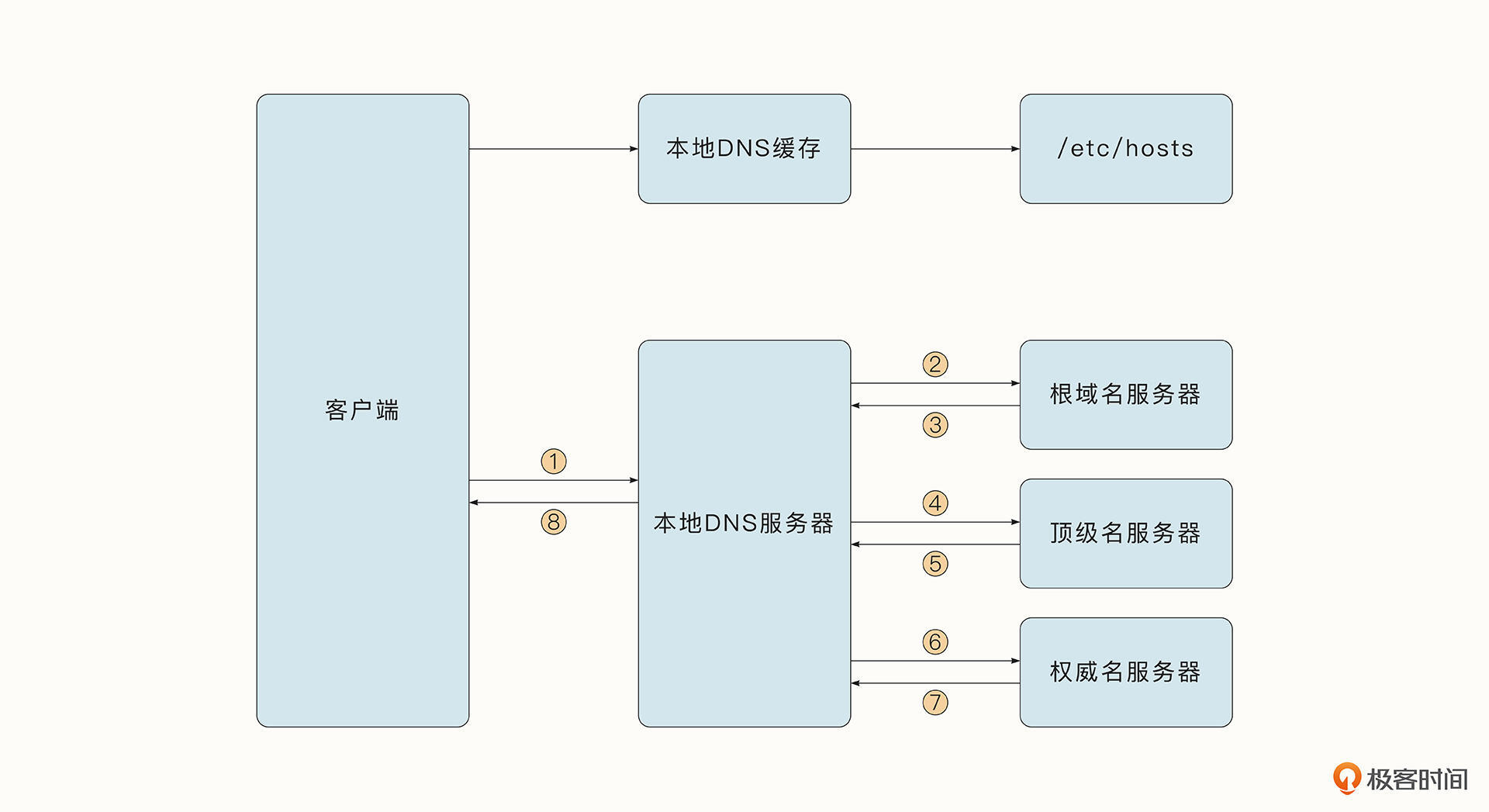 客户端首先查看是否有本地缓存,如果没有,则会用递归方式从权威域名服务器中获取DNS信息并缓存下来。如果你想深入了解DNS协议,可以参考《Introduction to Computer Networks and Cybersecurity》的第二章。