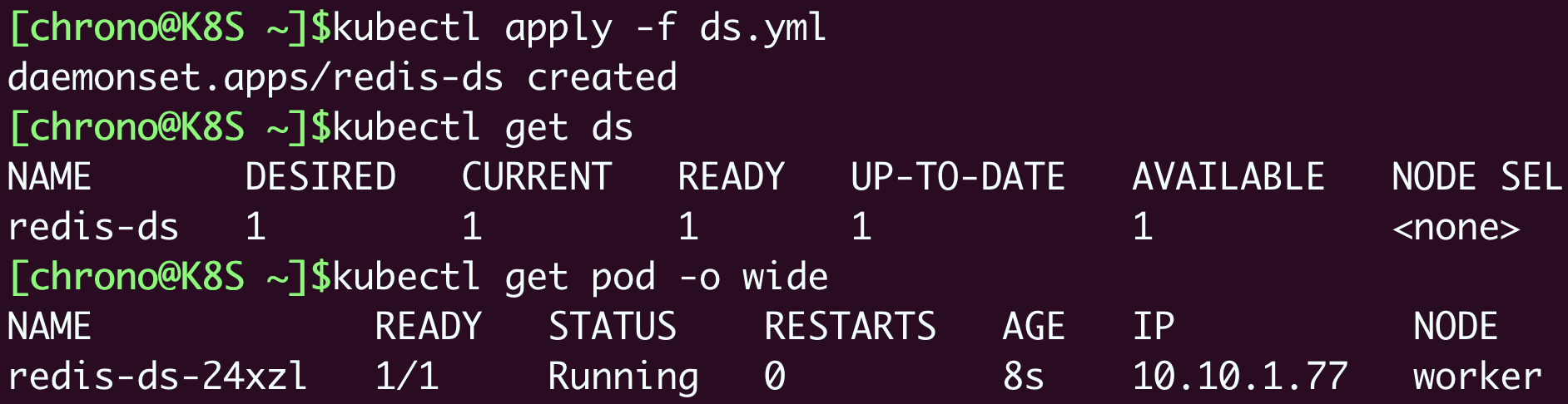 现在,让我们执行命令 kubectl apply,把YAML发送给Kubernetes,让它创建DaemonSet对象,再用 kubectl get 查看对象的状态: