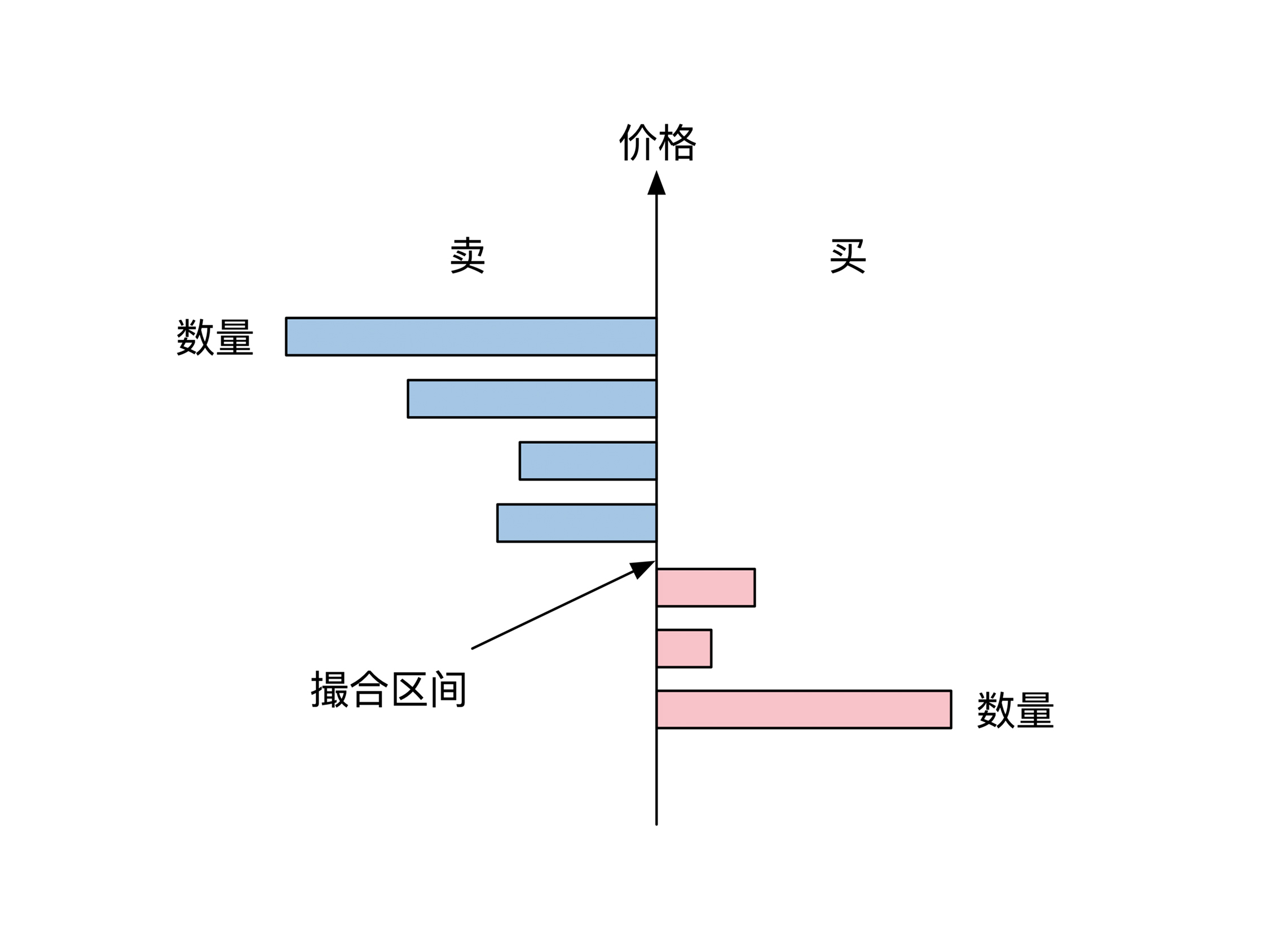 交易所的主要功能是撮合买方和卖方。交易所在系统内维护了还没有成交的卖方订单和买方订单。当一个新的订单进来的时候,交易所会查看能不能成交。如果不能成交就等待下一笔订单。这个撮合逻辑非常简单直白,示意图如下: