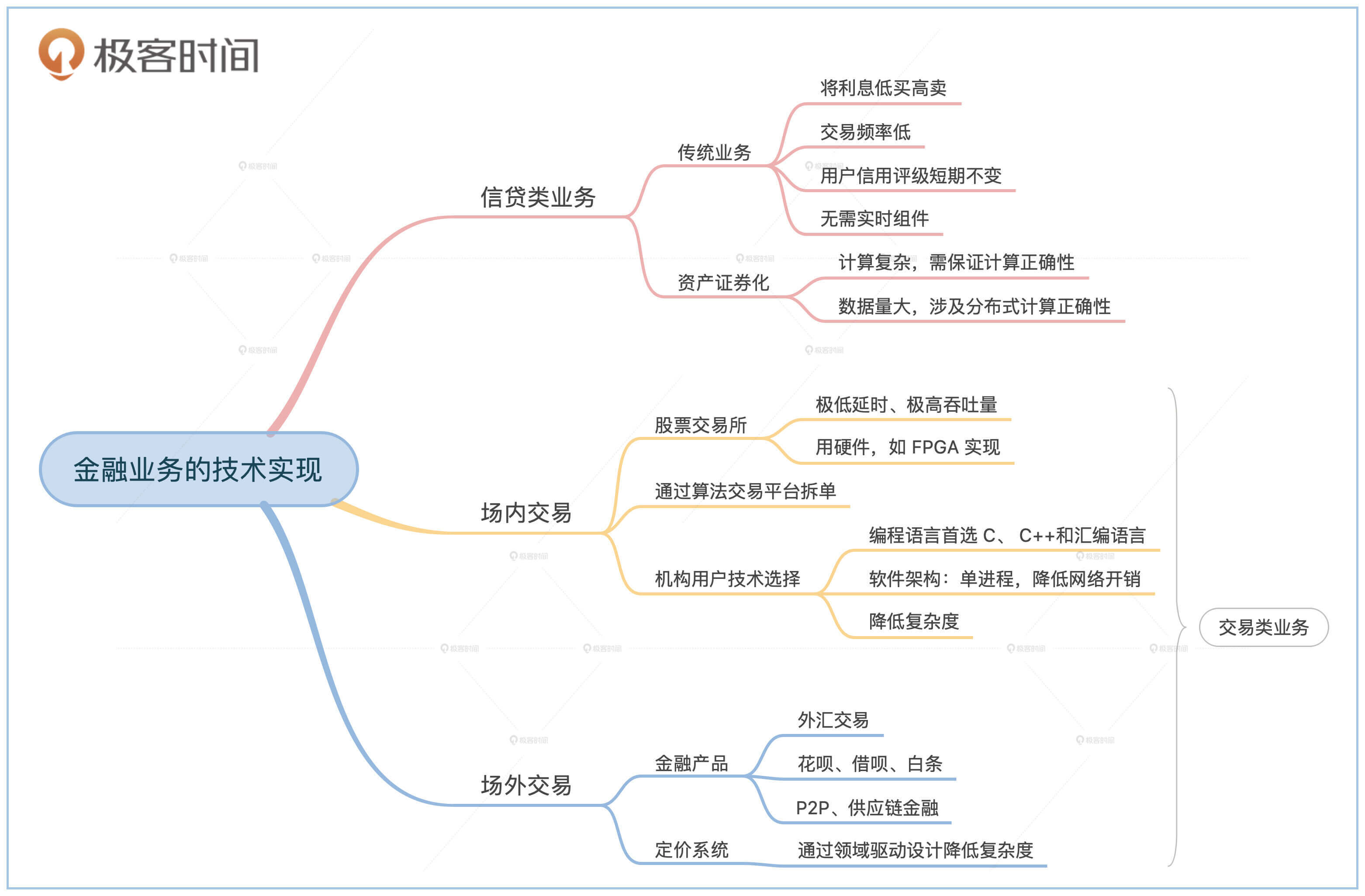 这节课我给你讲了不同的金融业务都有哪些技术实现要点。