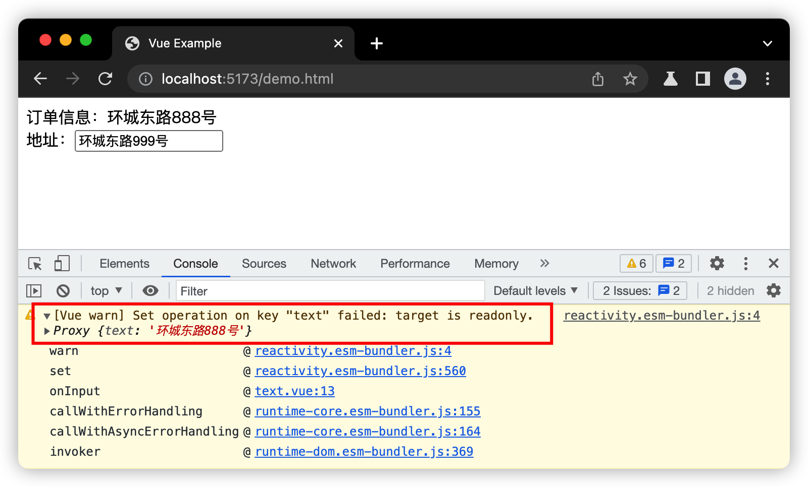 以下代码是一个简单的文本编辑实时显示的组件,由两个组件嵌套组成,其中父组件包括了文本信息实时显示,子组件是文本输入框。父组件的通过 ref生成的响应式数据通过props传入子组件进行显示和修改。当子组件修改父组件props传入的响应式数据,控制台将会报错。