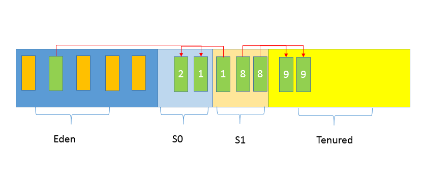 第一,Java应用不断创建对象,通常都是分配在Eden区域,当其空间占用达到一定阈值时,触发minor GC。仍然被引用的对象(绿色方块)存活下来,被复制到JVM选择的Survivor区域,而没有被引用的对象(黄色方块)则被回收。注意,我给存活对象标记了“数字1”,这是为了表明对象的存活时间。