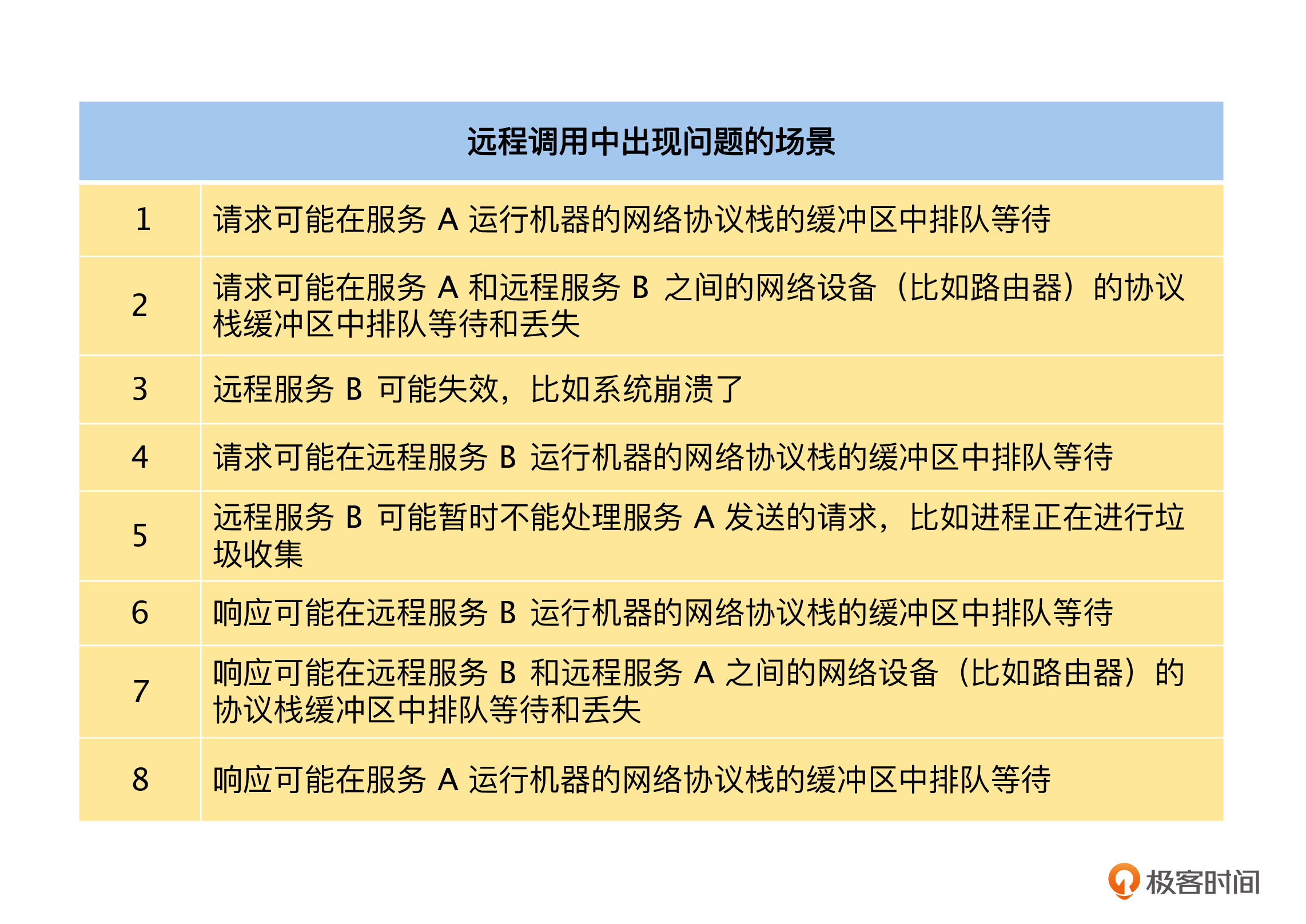 所以你会发现,远程调用在时间上有不确定性,那么我们就来讨论一下,服务 A 通过网络远程调用服务 B 可能会出现哪些不确定的情况。在我们使用极客时间 App 的过程中,如果出现加载不出来或者系统内部错误的问题,主要和远程调用模型面临的网络排队、丢包和请求服务崩溃等情况有关,具体的场景和示意图如下: