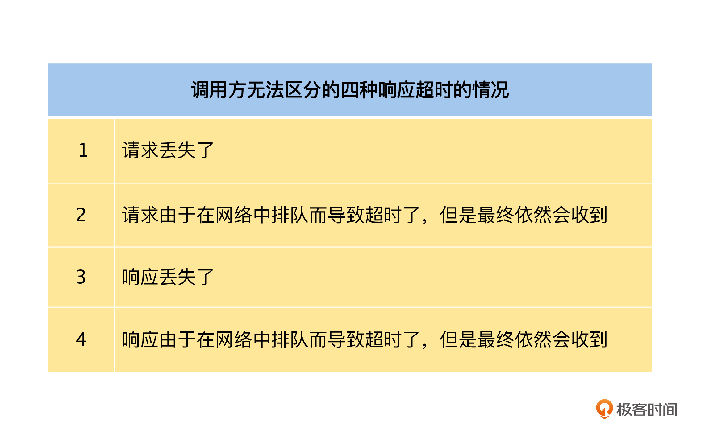 但是,如果请求在超时时间内没有收到任何响应,即响应超时,那么调用方将无法区分下面四种情况: