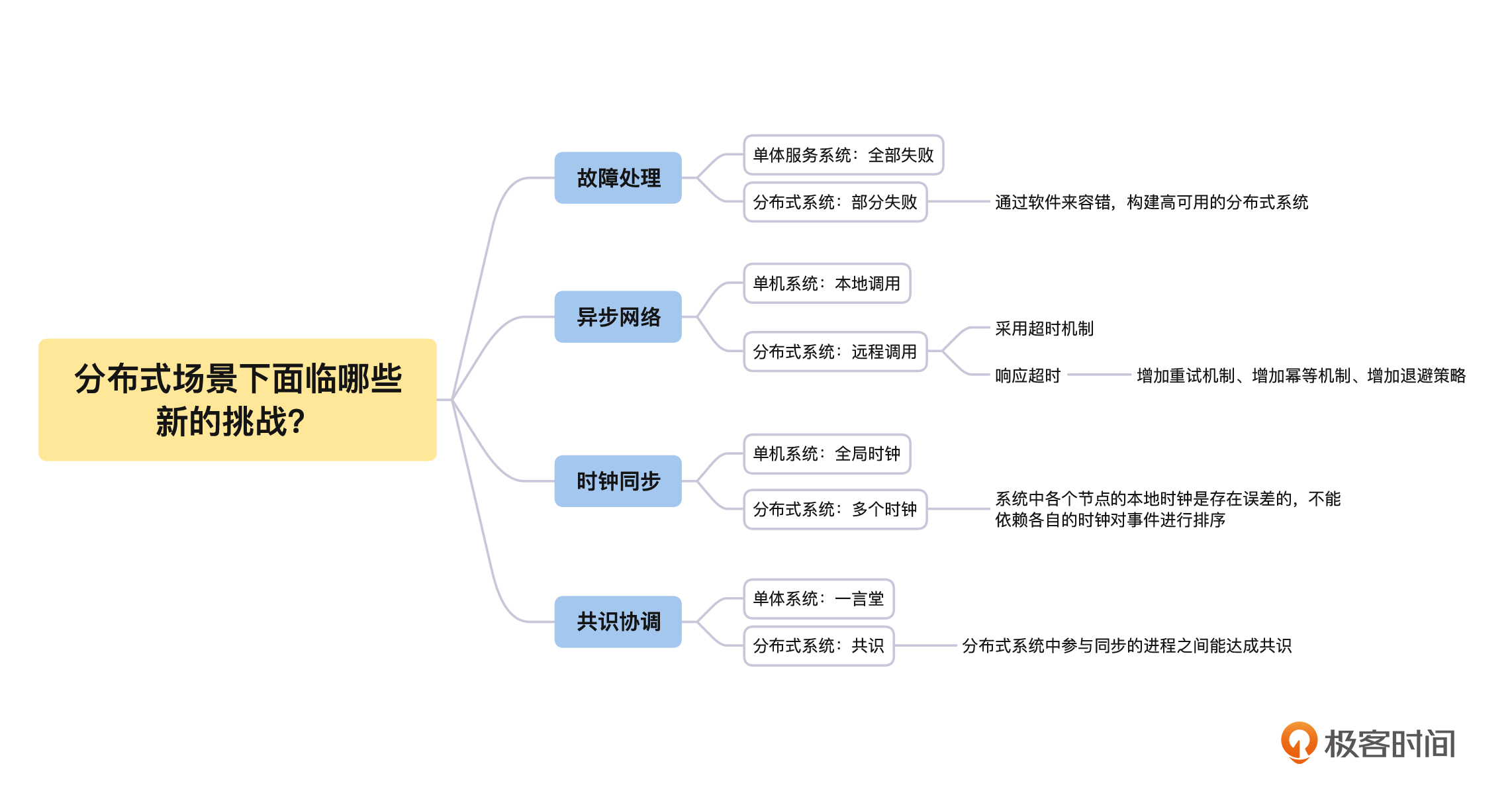 到这里,我们一起讨论了在分布式系统场景下面临的新挑战,我们一起来总结一下这节课的主要内容: