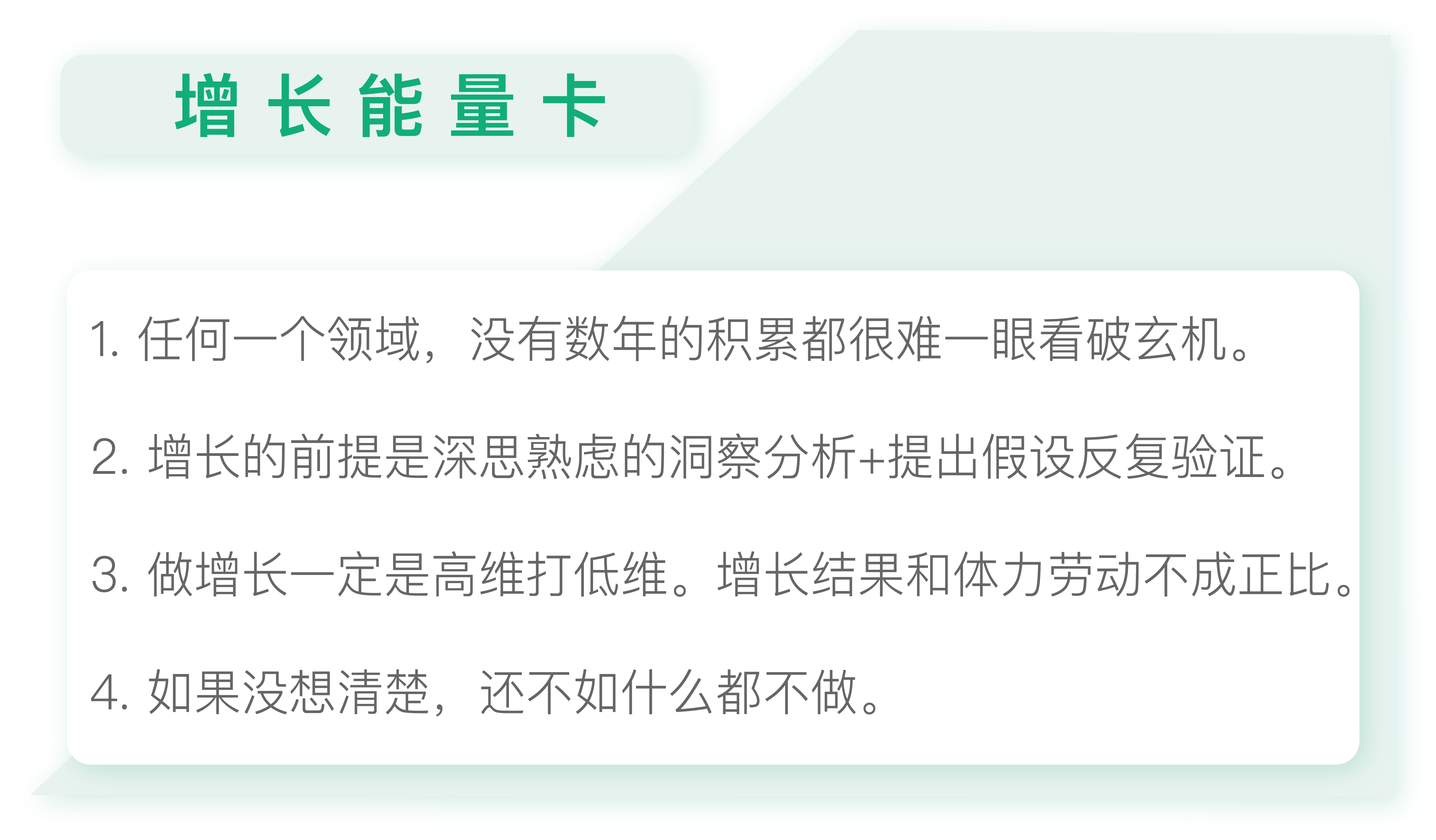 虽然专栏的名字叫《从0开始学增长》,但这里的0只是指零增长基础。如果没有若干年的工作经历,没有其它方面过硬的专业技能,可能也很难领悟。